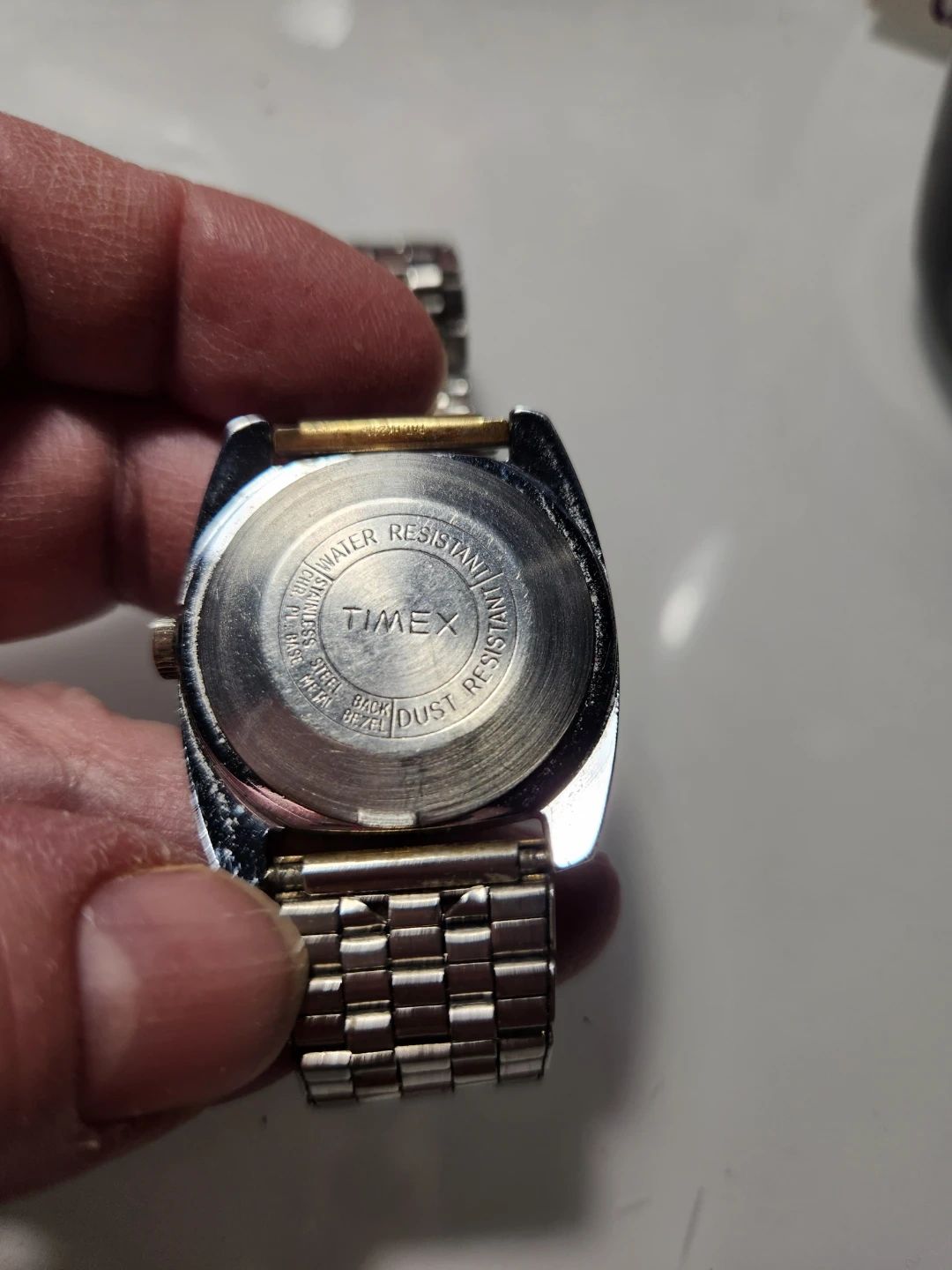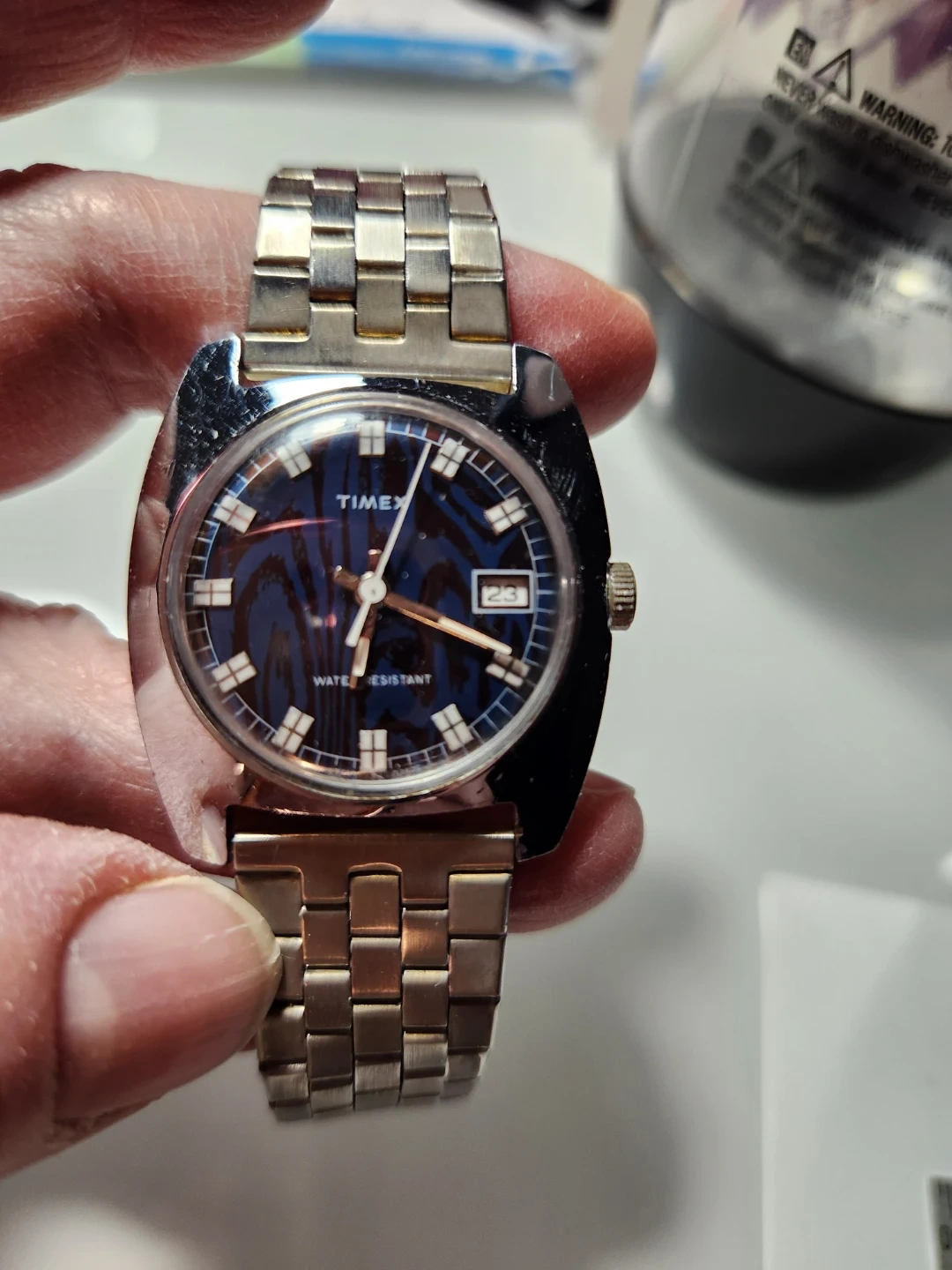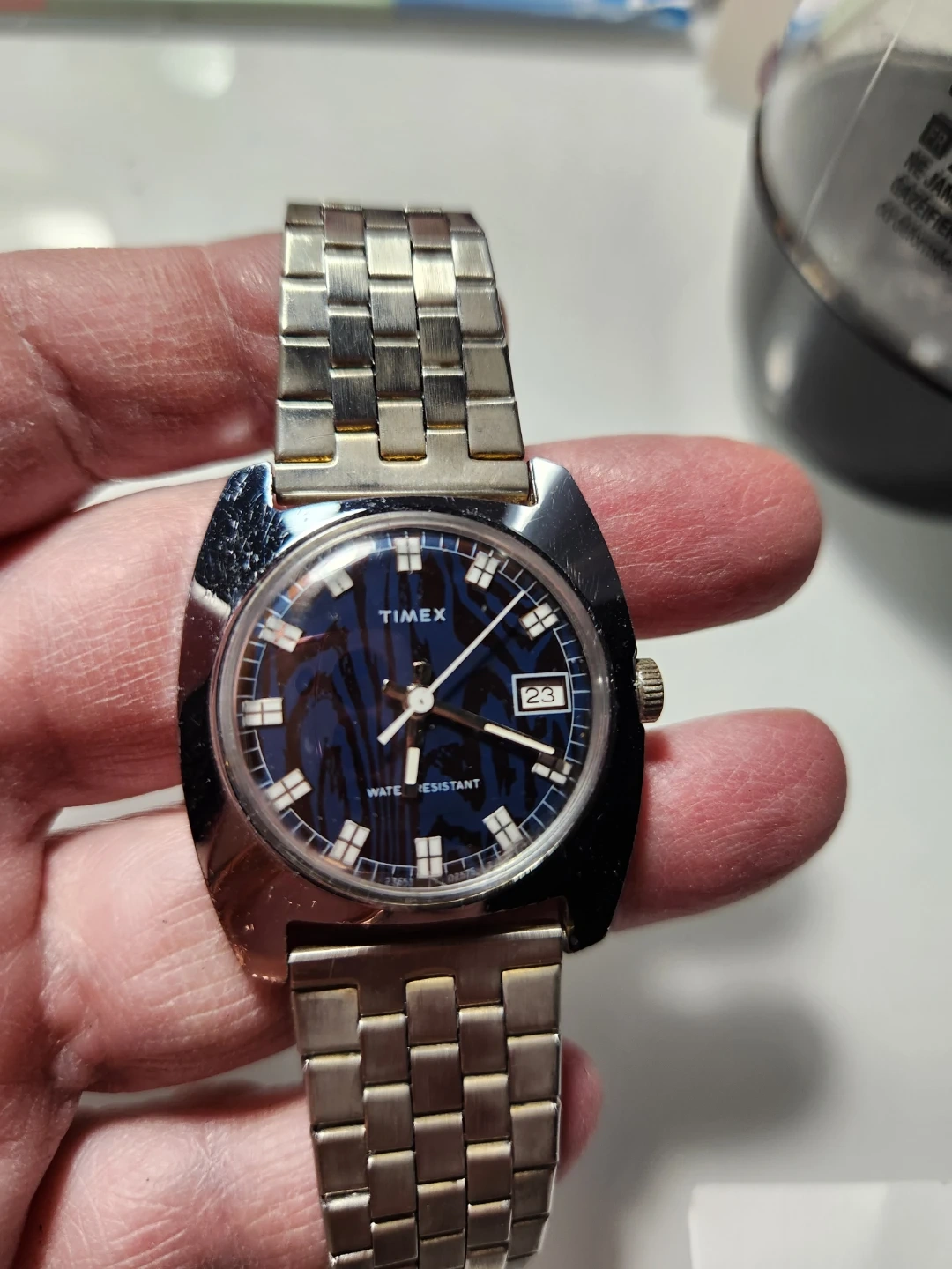 A vintage Timex watch with a blue patterned dial and date window. It's water-resistant with an interesting adjustable stainless steel band.