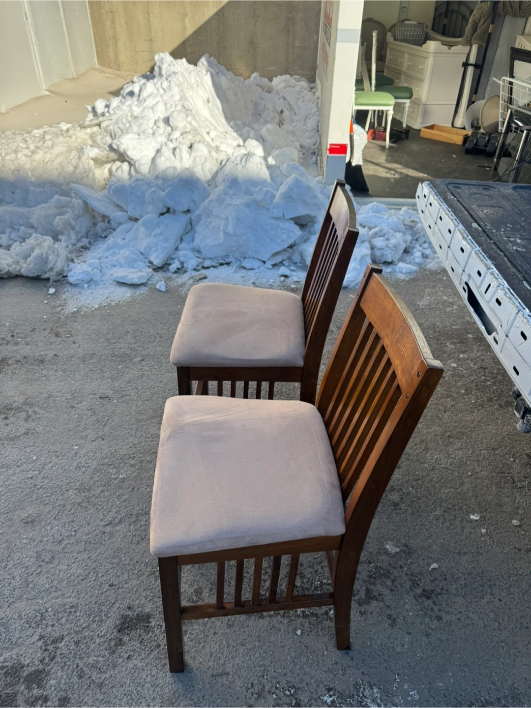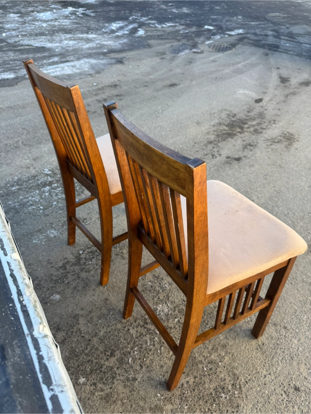 A set of two wooden dining chairs. They feature upholstered seats in a light neutral color. The chairs have a classic design with slatted backs. They're made of solid wood.