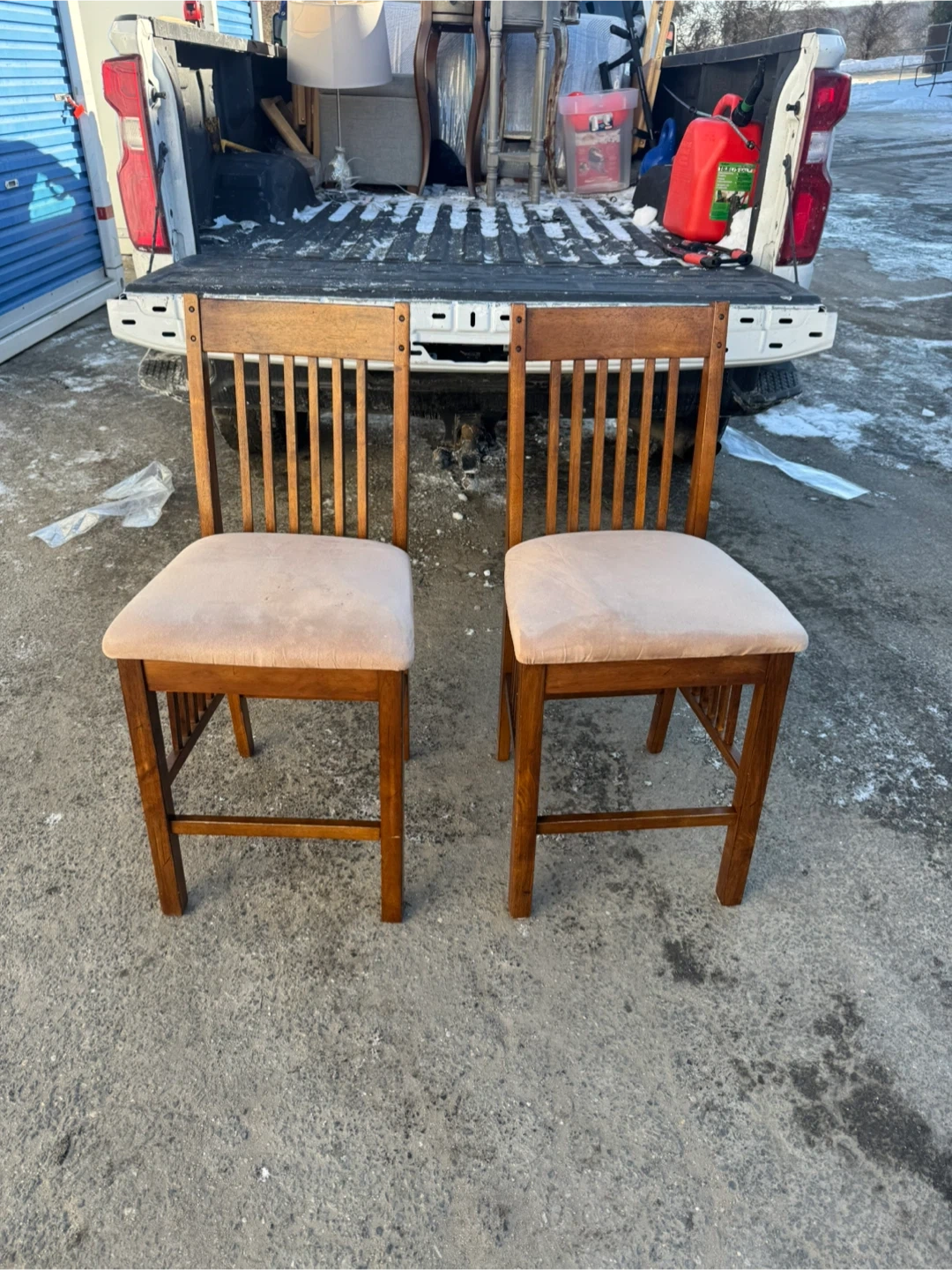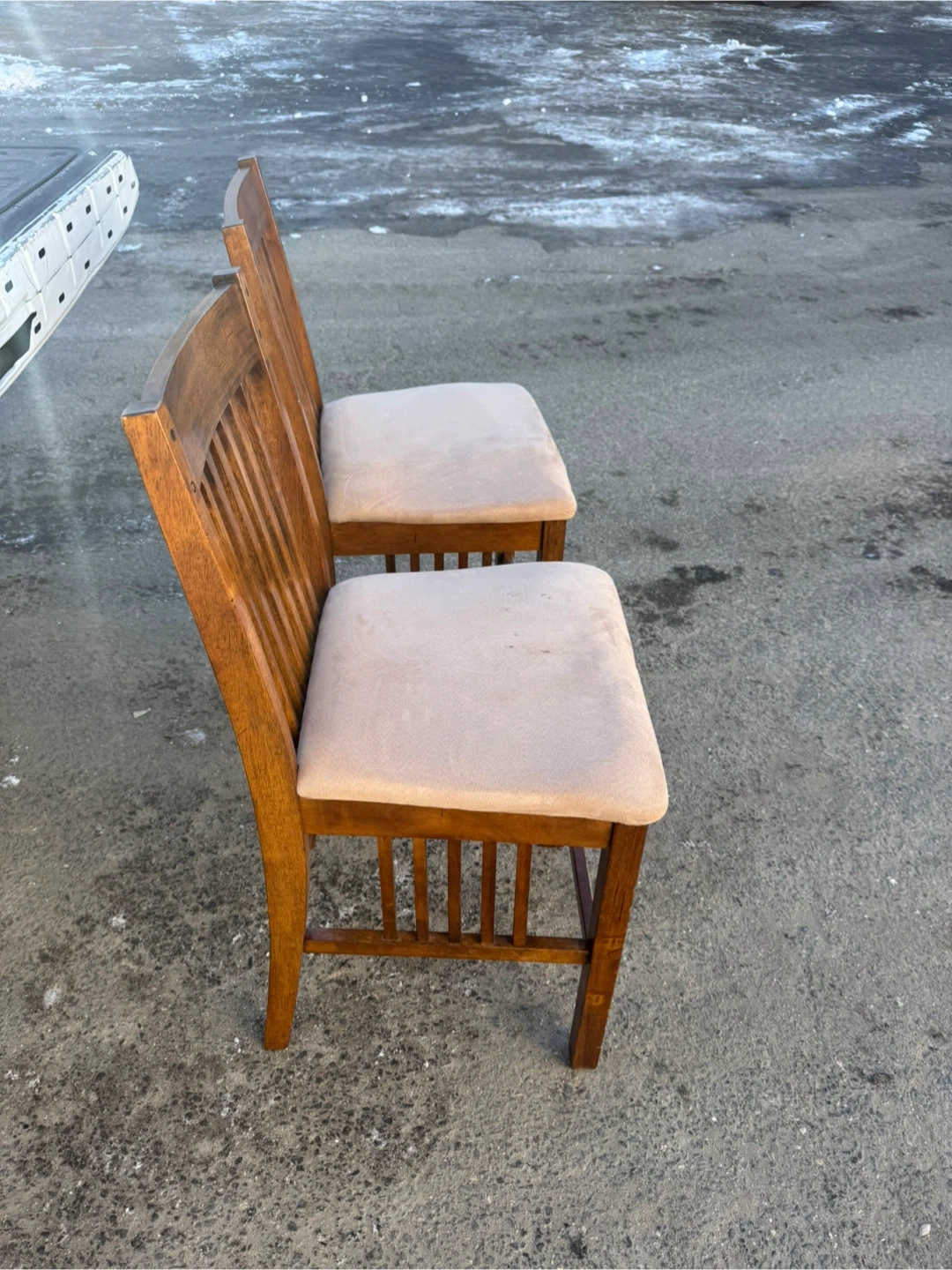 A set of two wooden dining chairs. They feature upholstered seats in a light neutral color. The chairs have a classic design with slatted backs. They're made of solid wood.