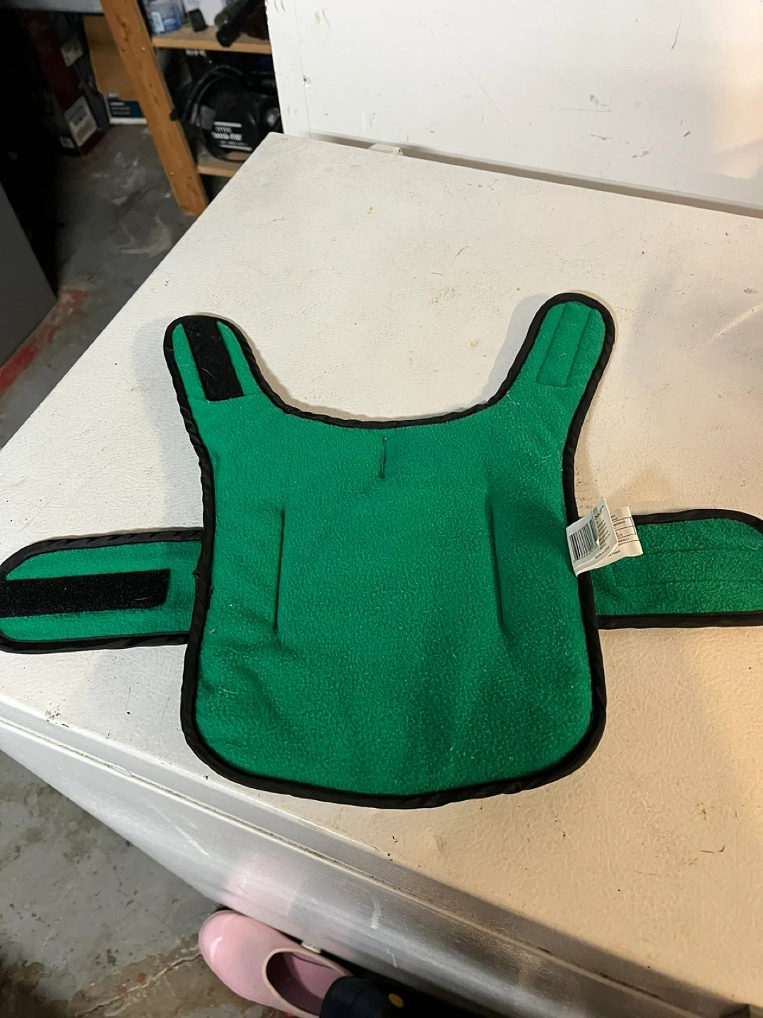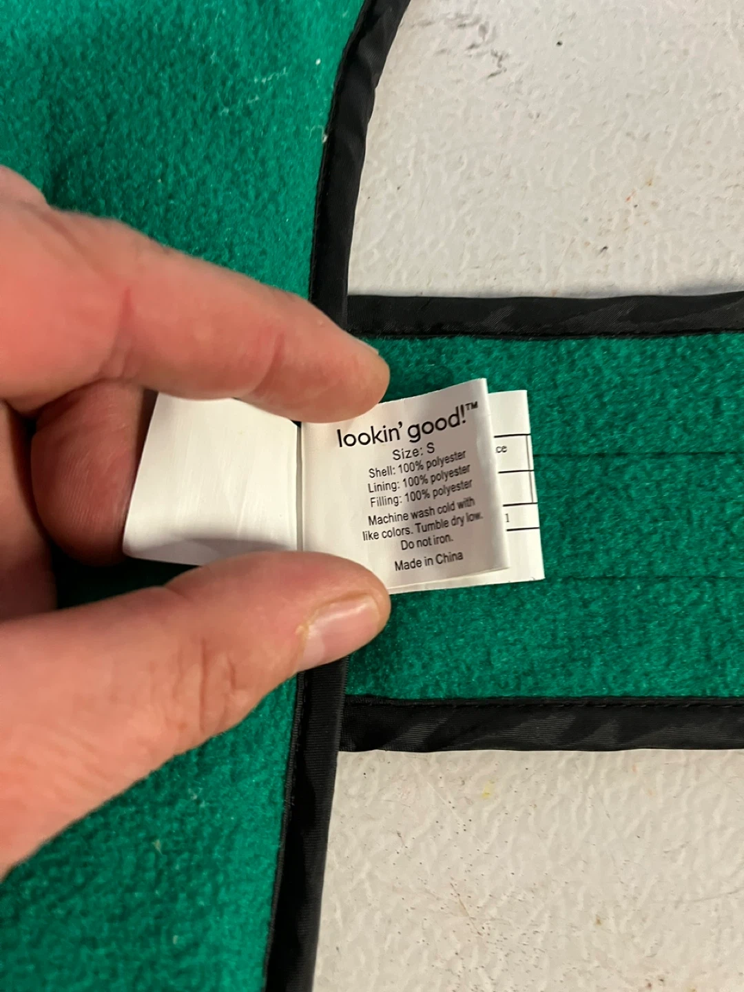 This is a green pet vest from Lookin Good!. It's size small with a polyester shell, lining, and filling. Machine wash cold with like colours. Tumble dry low. Do not iron. Made in China.