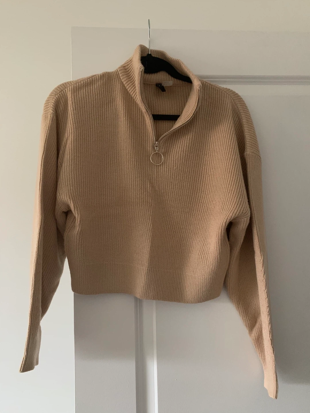 This is a beige, ribbed, quarter-zip sweater from Divided by H&M. It's made of a soft knit material. The sweater is a size medium.
