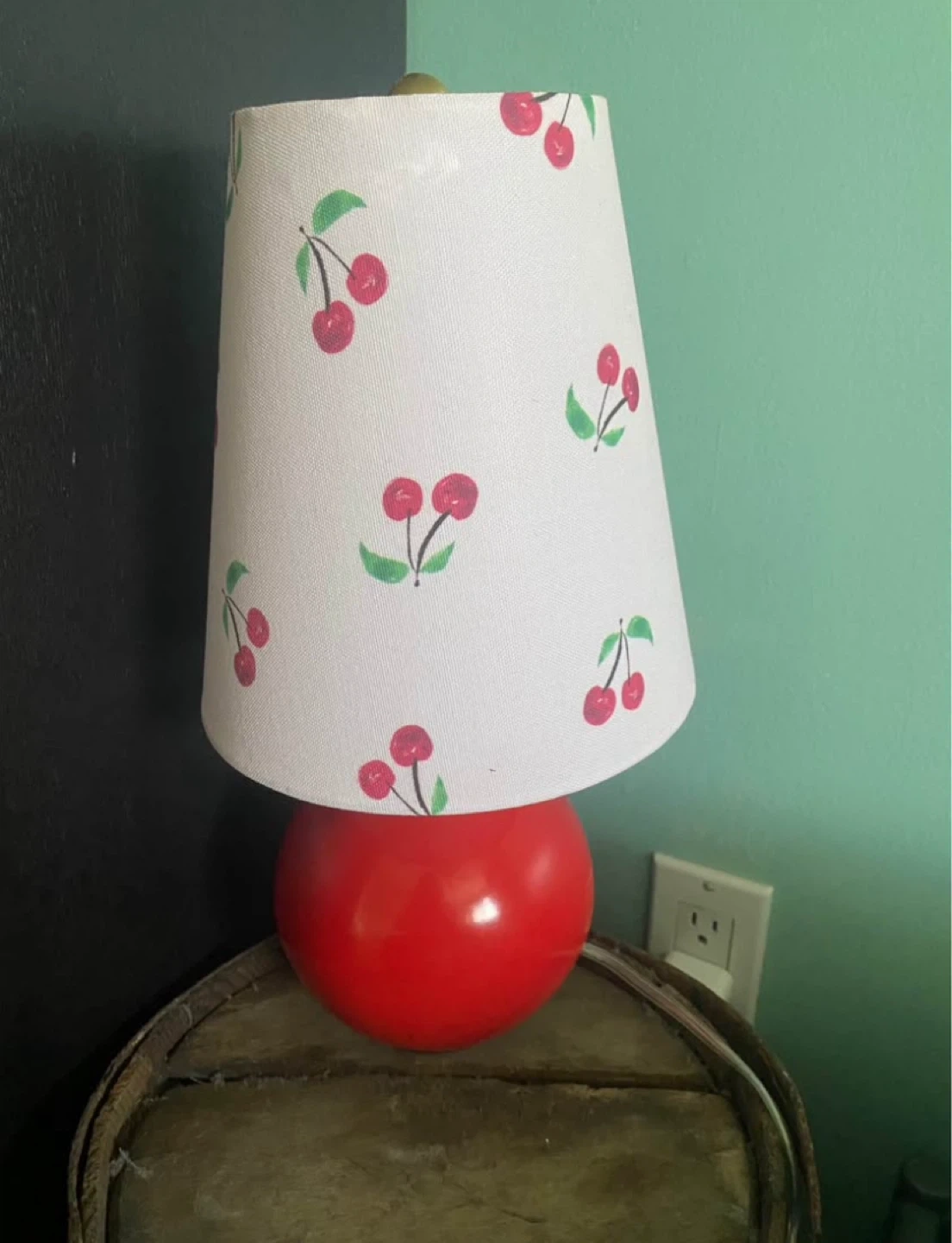 A cute table lamp with a white lampshade featuring a red cherry pattern. The base is a bright red, round shape. It's a fun addition to any room!