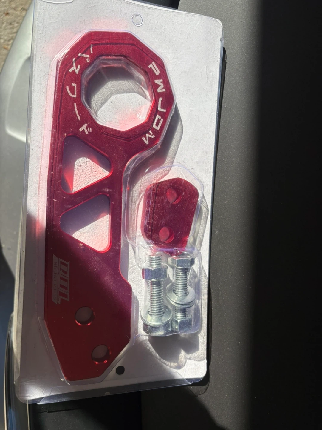 This is a red DDL Industries tow hook, made from aluminum. It comes with bolts and a mounting plate. It's designed for performance vehicles.