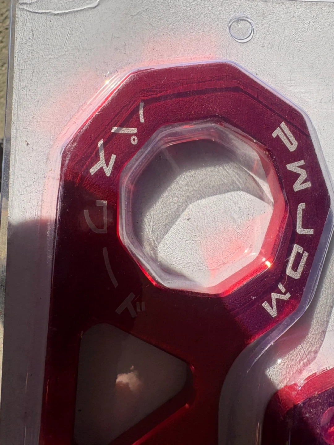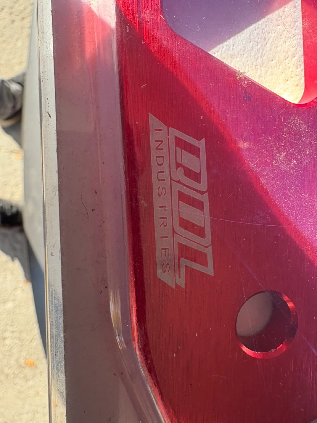 This is a red DDL Industries tow hook, made from aluminum. It comes with bolts and a mounting plate. It's designed for performance vehicles.