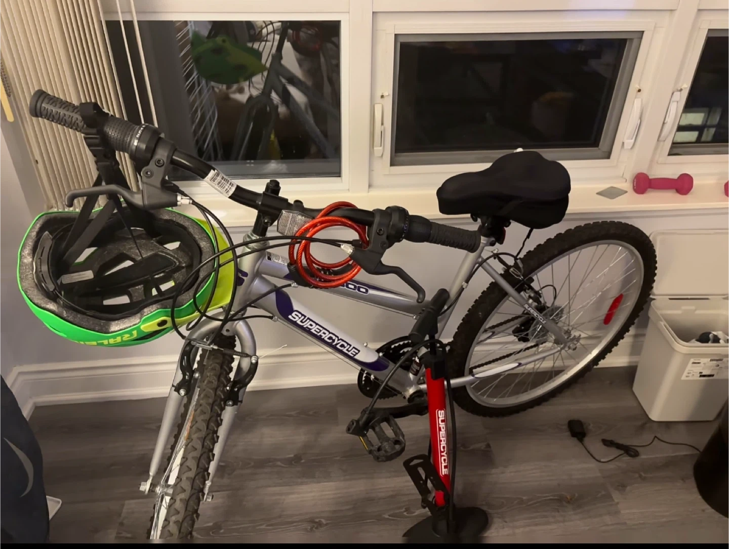 This is a Supercycle mountain bike, comes with a green helmet and a red Supercycle floor pump. It's a silver and purple adult bicycle, ready for some trails!
