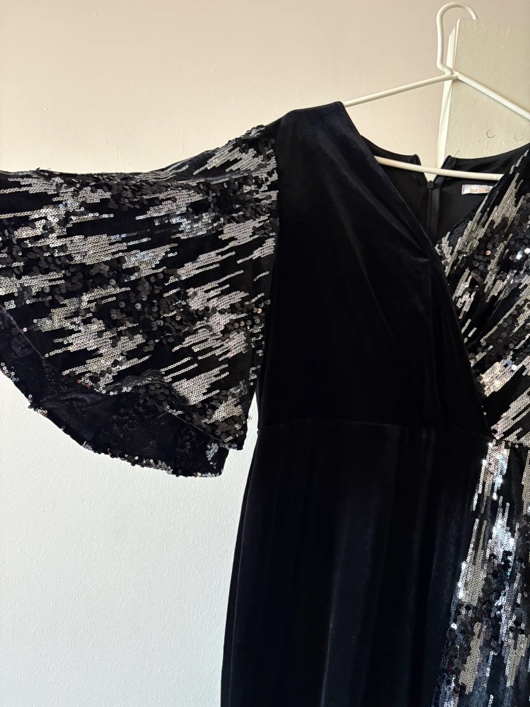 This elegant dress combines black velvet with eye-catching sequin sleeves. It's perfect for a night out or a special occasion. The dress features a flattering silhouette and dazzling detail on the sleeves.