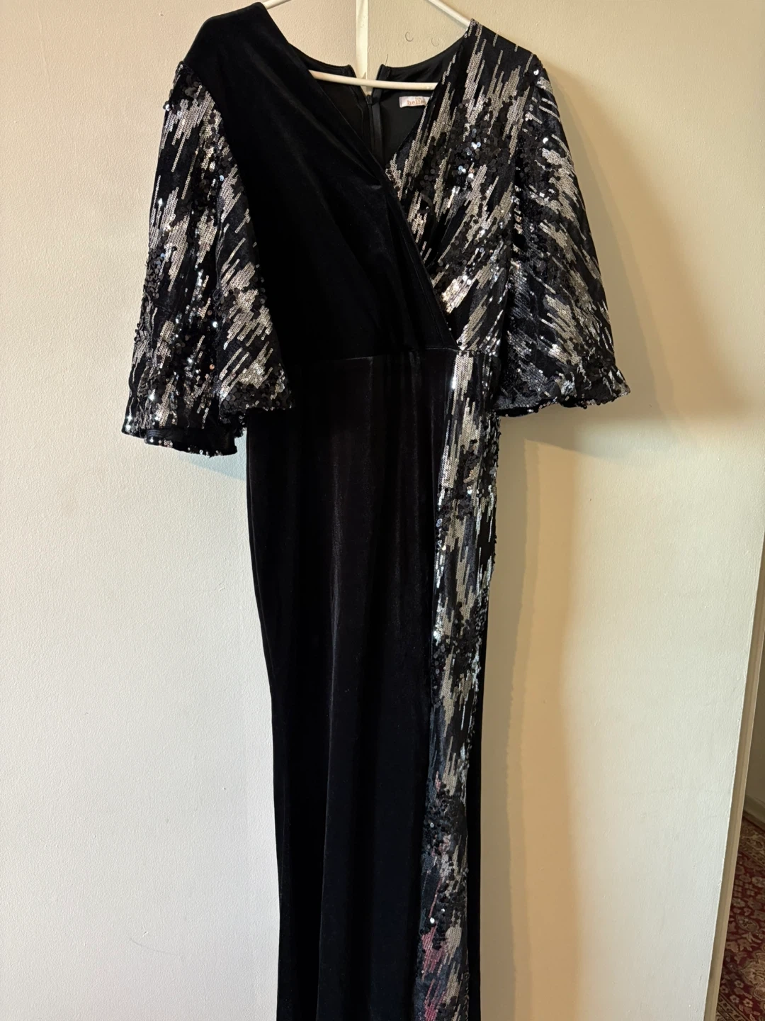 This elegant dress combines black velvet with eye-catching sequin sleeves. It's perfect for a night out or a special occasion. The dress features a flattering silhouette and dazzling detail on the sleeves.