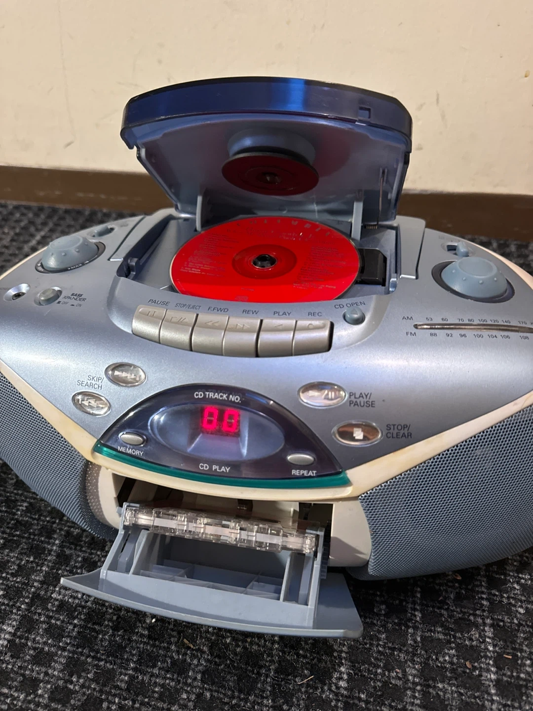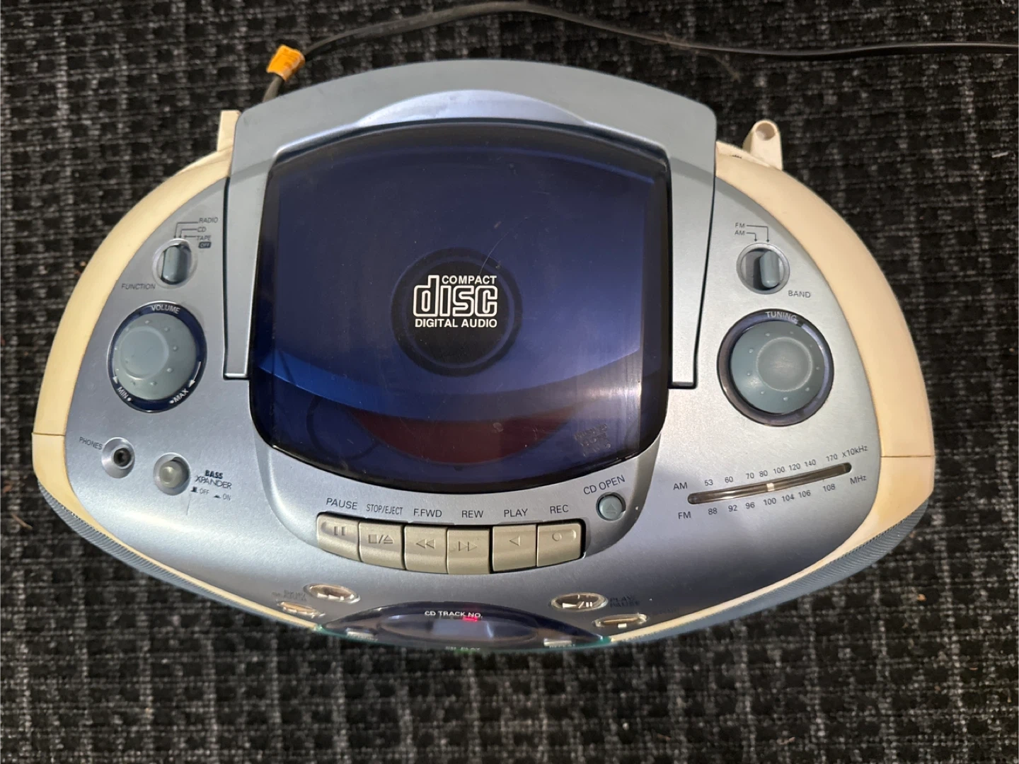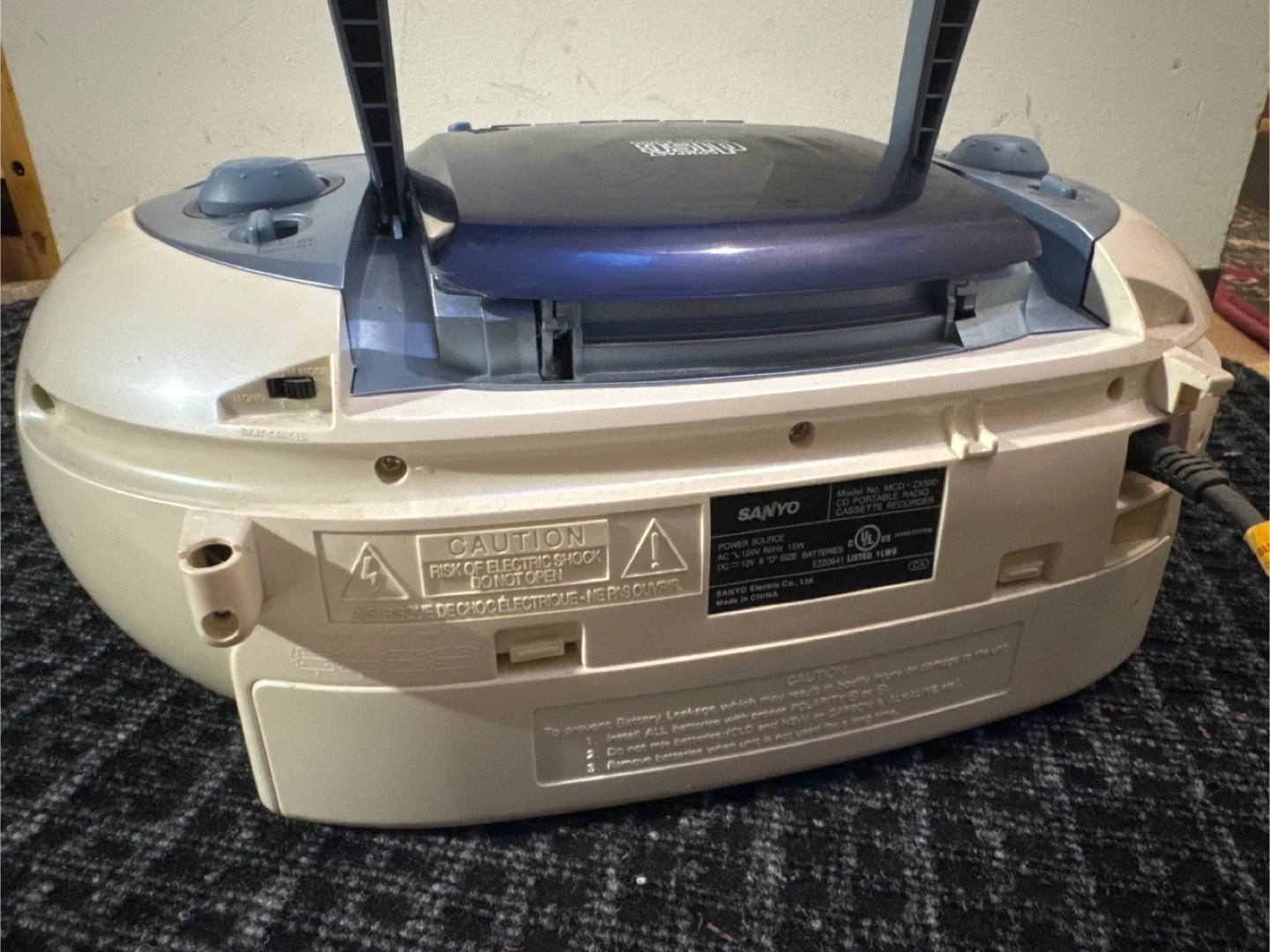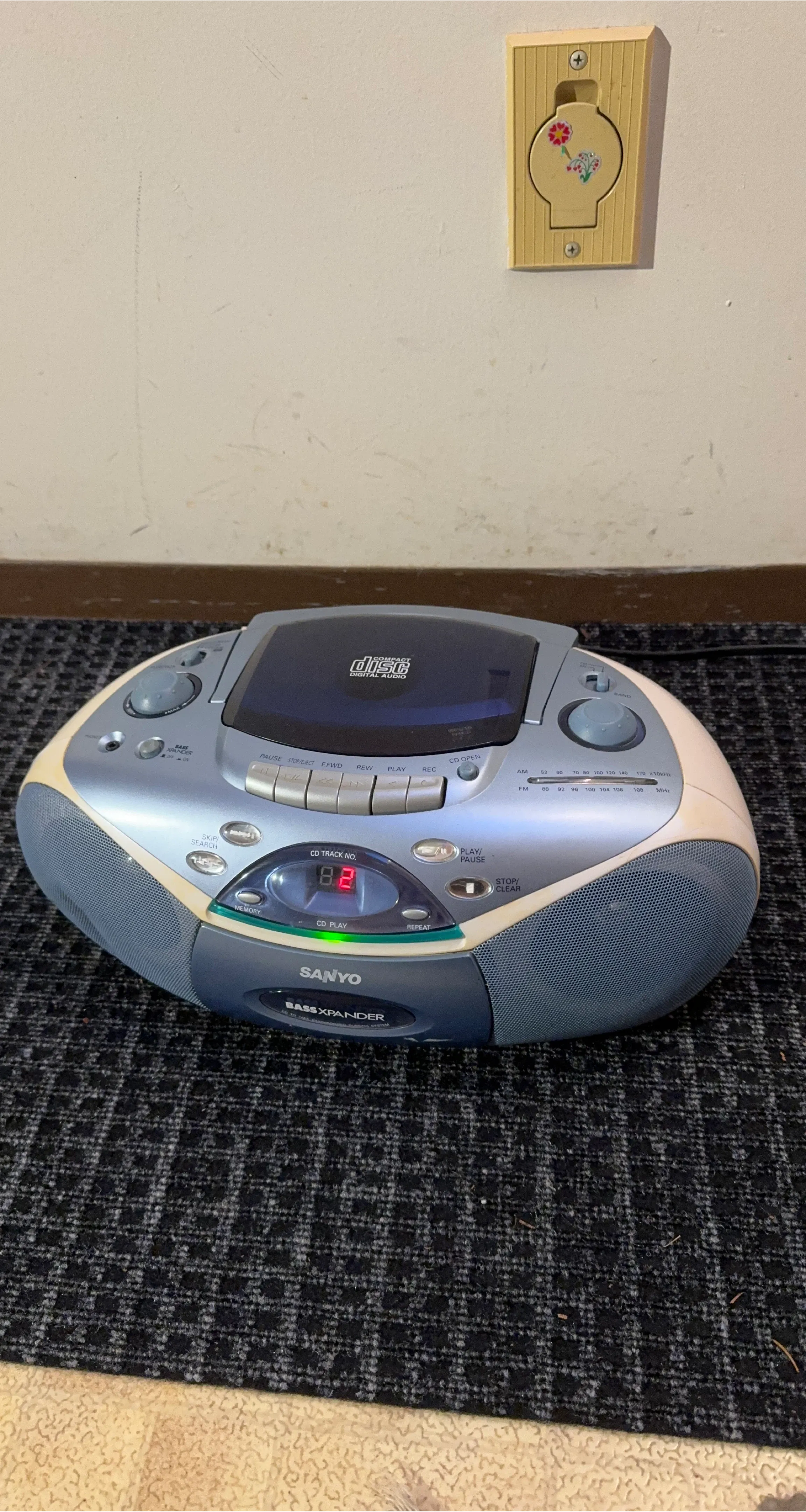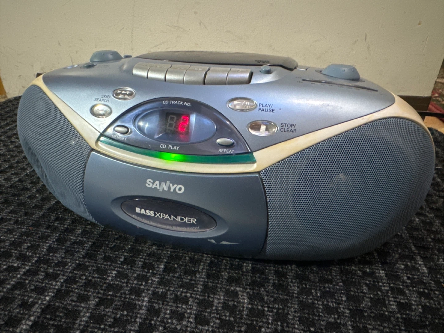 This Sanyo boombox features a CD player and CD to tape dubbing system and AM/FM radio. It includes Bass Xpander technology. Model MCD-X2800. Still works great and with cord included