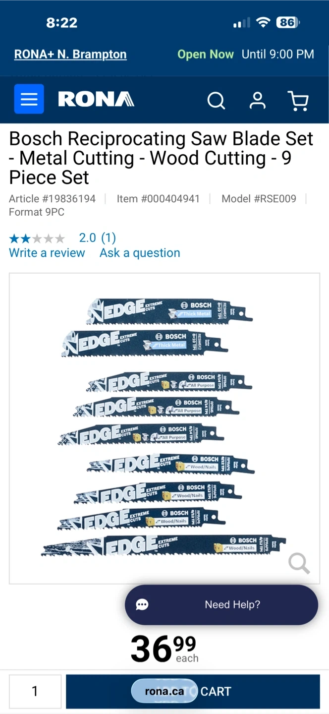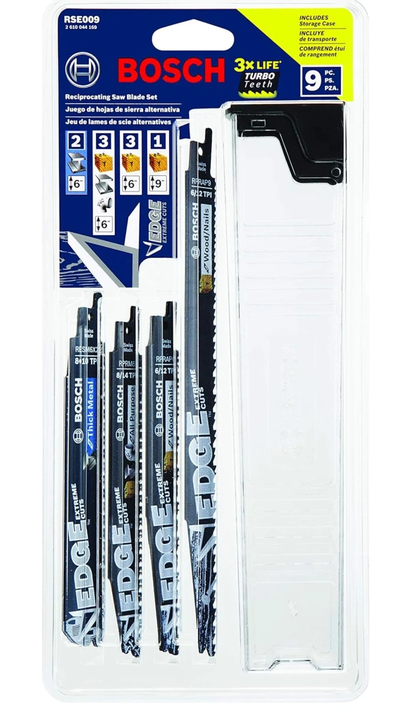 Bosch 9-piece reciprocating saw blade set includes blades for metal cutting, wood cutting, and general purpose use. Comes with a carrying case for convenient storage and transport. Blades feature EDGE technology for extreme cuts.