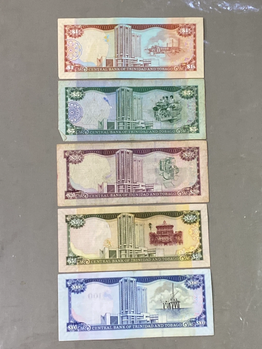 This listing includes a collection of banknotes from the Central Bank of Trinidad and Tobago. Denominations are one dollar, five dollars, twenty dollars, fifty dollars, and one hundred dollars. These are official currency notes.