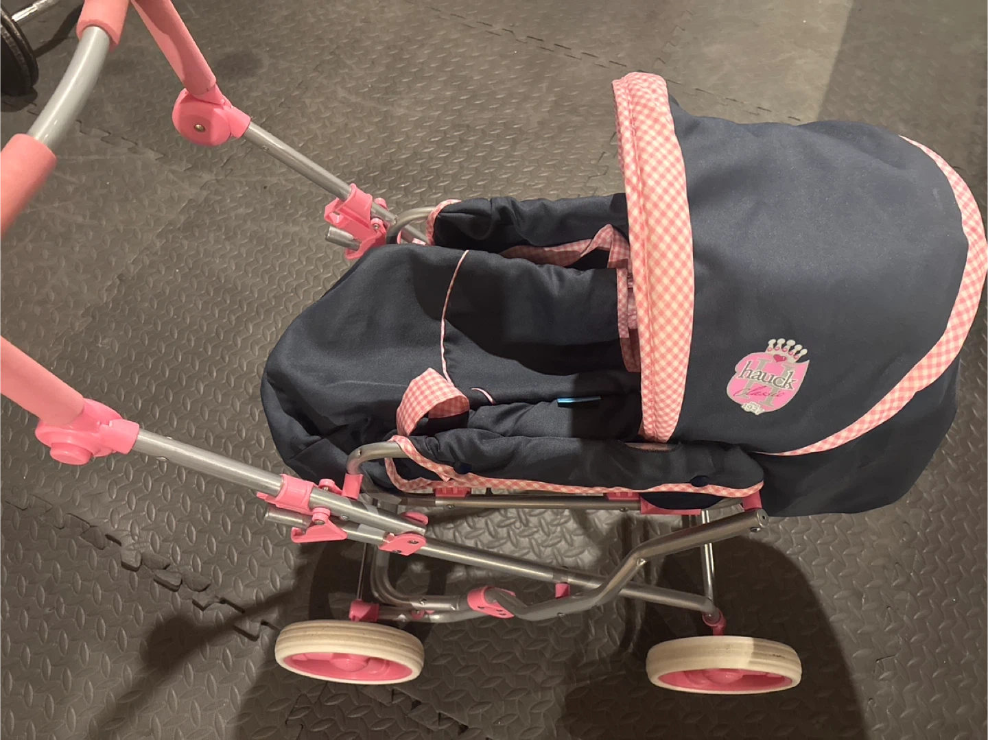This is a doll stroller with navy blue fabric and pink gingham accents. It has a silver-toned frame and pink handles. It's a fun accessory for imaginative play. Comes with baby carrier.