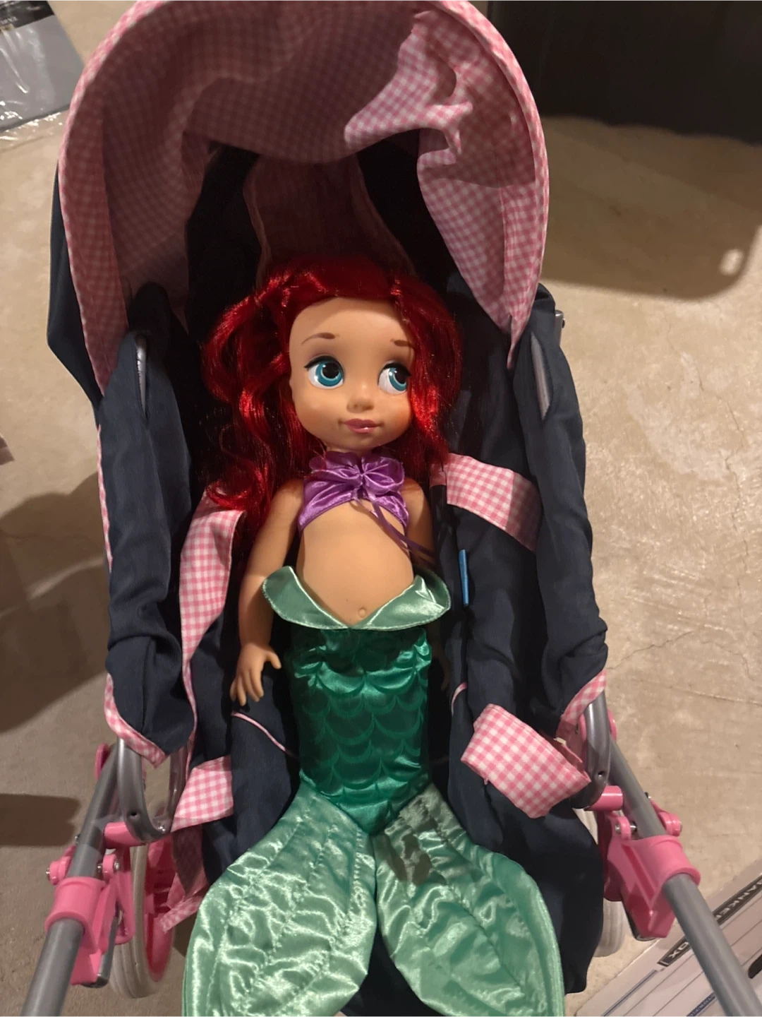 Doll Stroller with Pink Gingham Accents plus mermaid doll