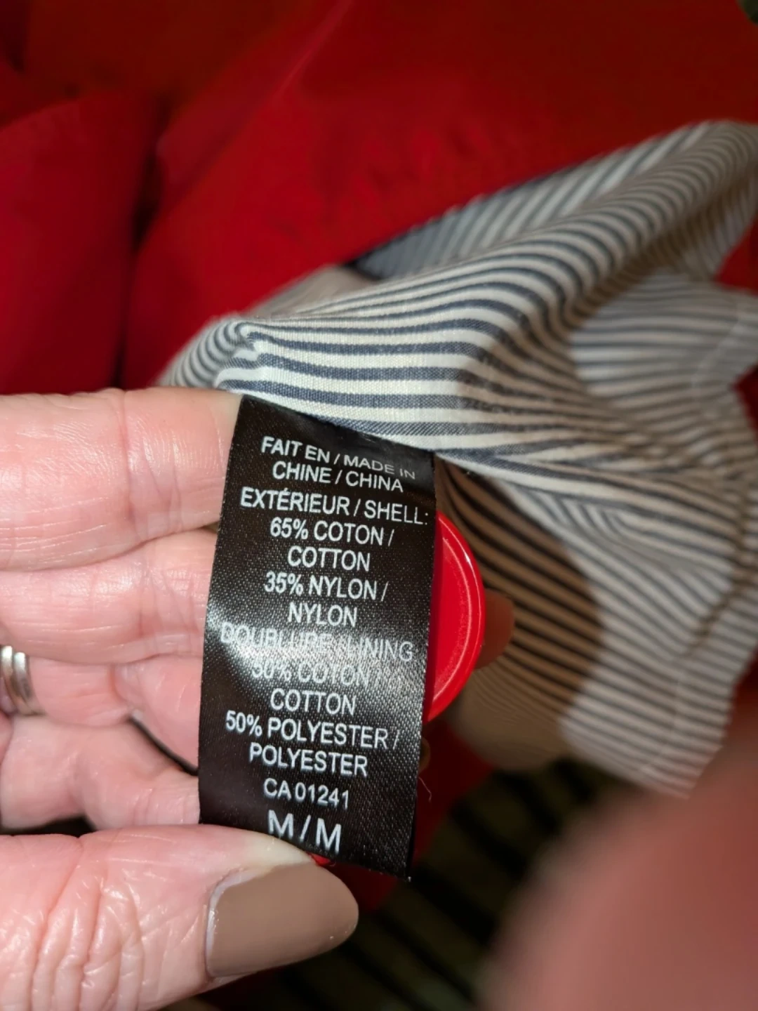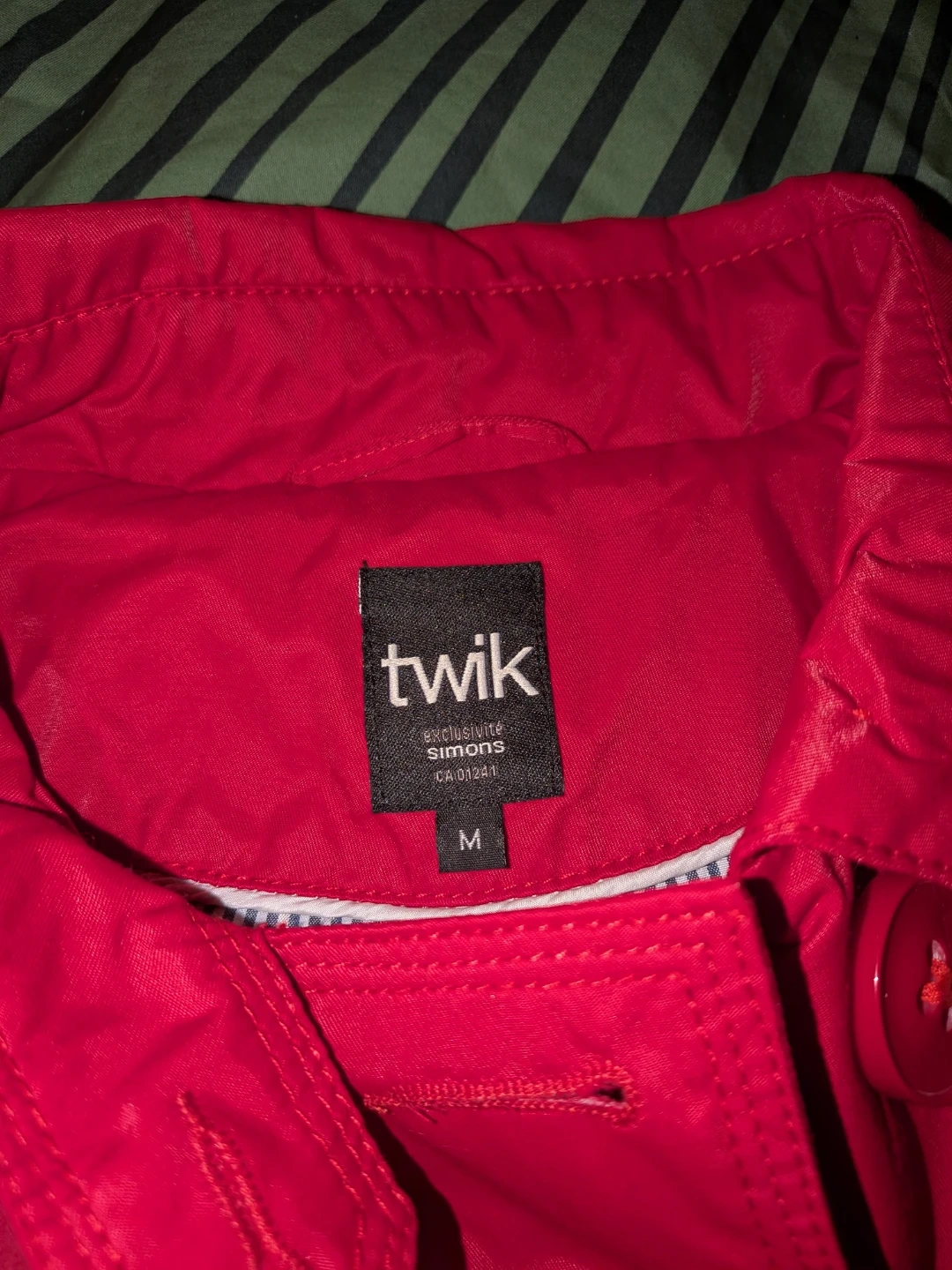 This red Twik jacket is a stylish double-breasted trench coat. It's made with a cotton blend and features a removable belt. It's a size M from Simon's