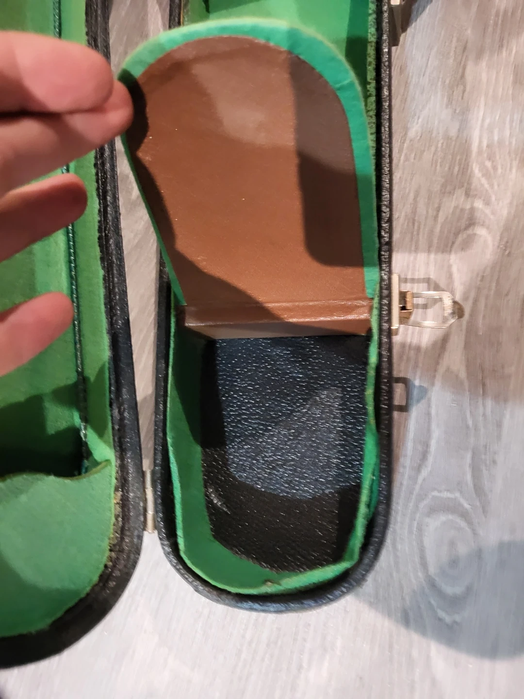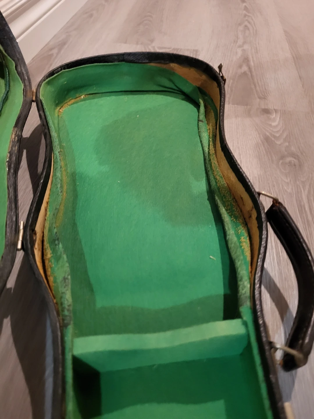 A black violin case with green interior lining. It has a handle and two latches for closure. Some wear and tear visible on the exterior.