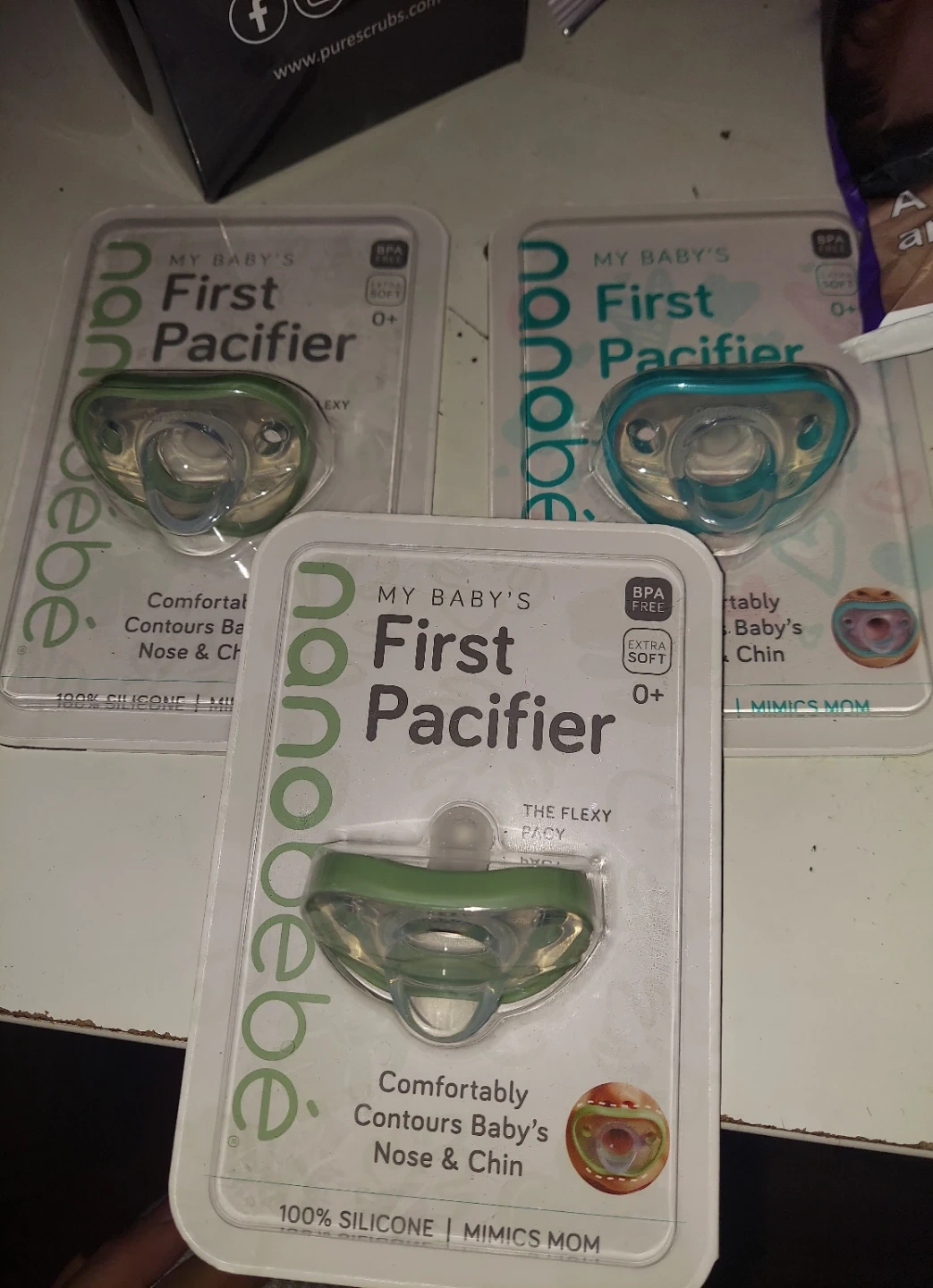 Set of three Nanobebe My Baby's First Pacifiers. They're BPA free and extra soft. 100% silicone construction that mimics mom. Contours comfortably to baby's nose and chin.
