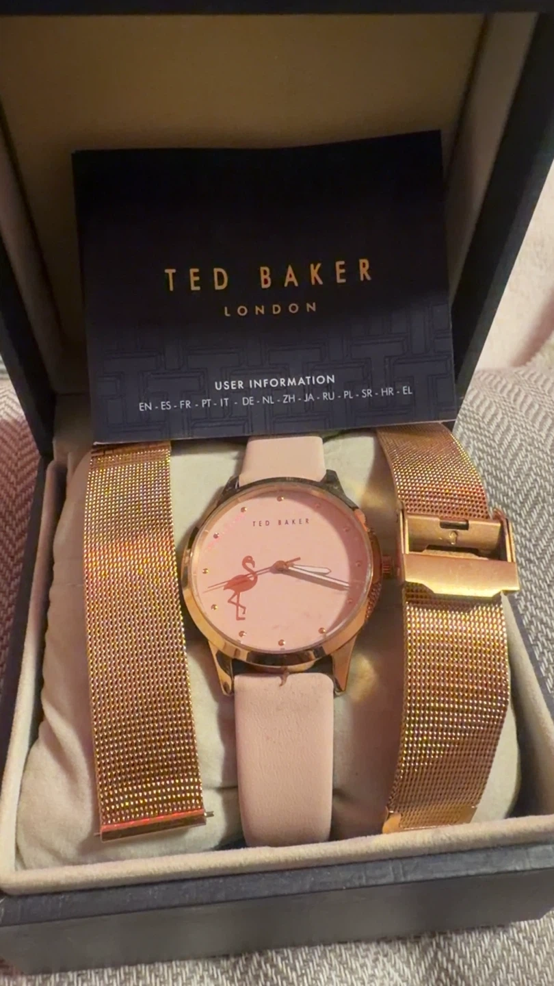 This Ted Baker London watch features a rose gold-tone case. It comes with a mesh rose gold-tone strap and a second pink leather strap. The watch is presented in its original box with user information. Would make as a great valentines present!