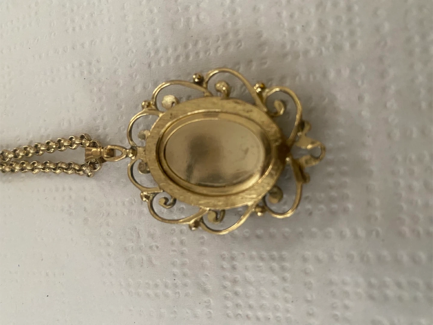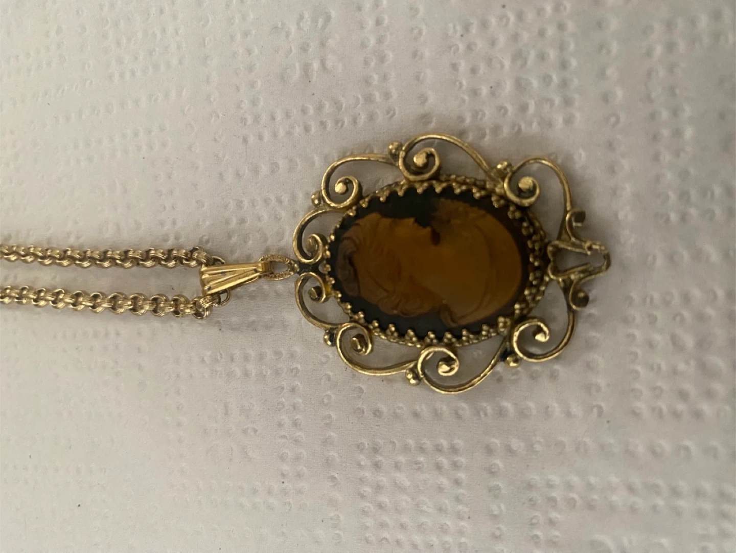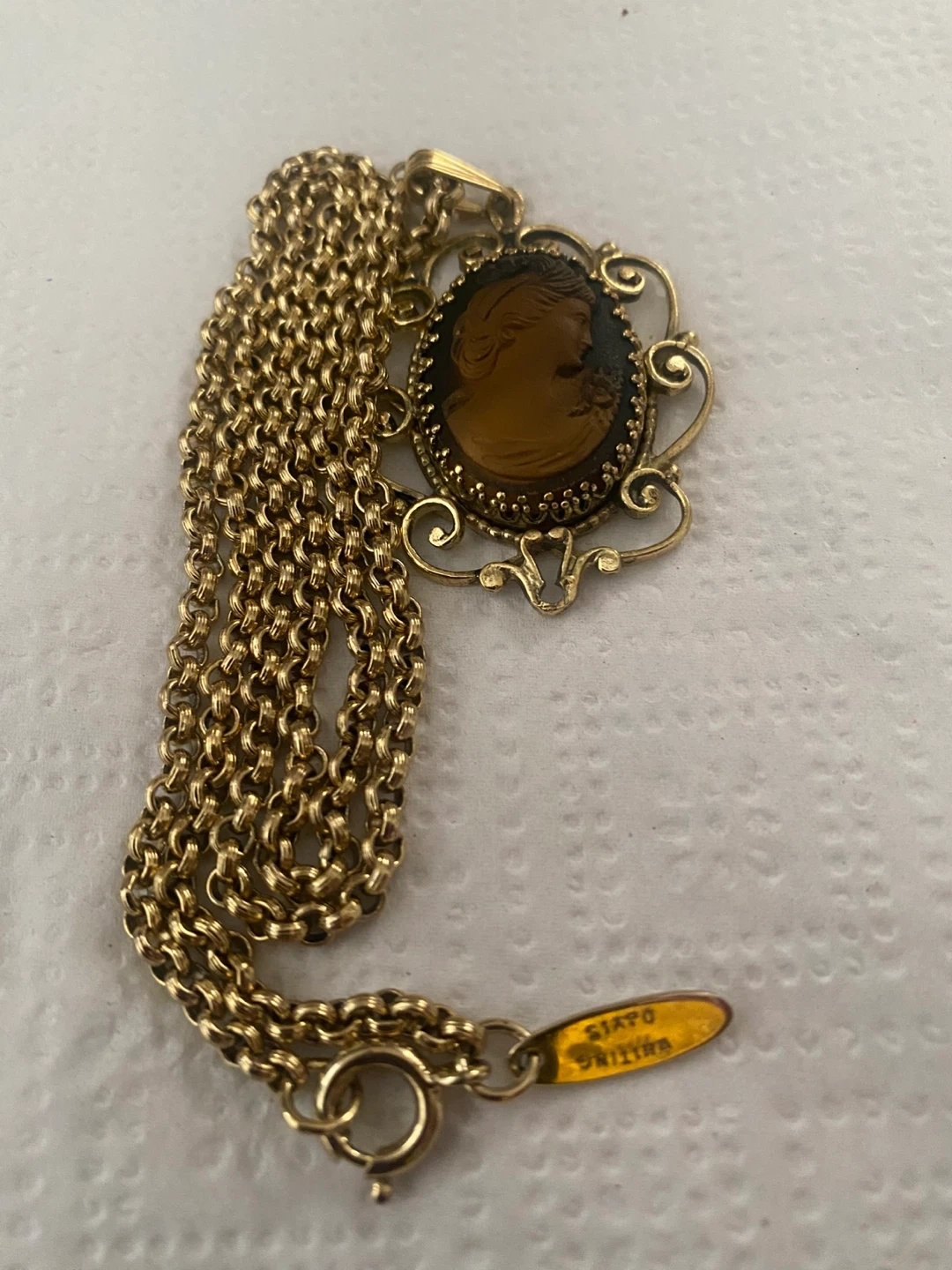 A beautiful vintage cameo pendant necklace. The pendant features an oval-shaped cameo set in a decorative gold-tone metal frame. It hangs on a delicate gold-tone chain. A classic accessory for any jewellery collection!