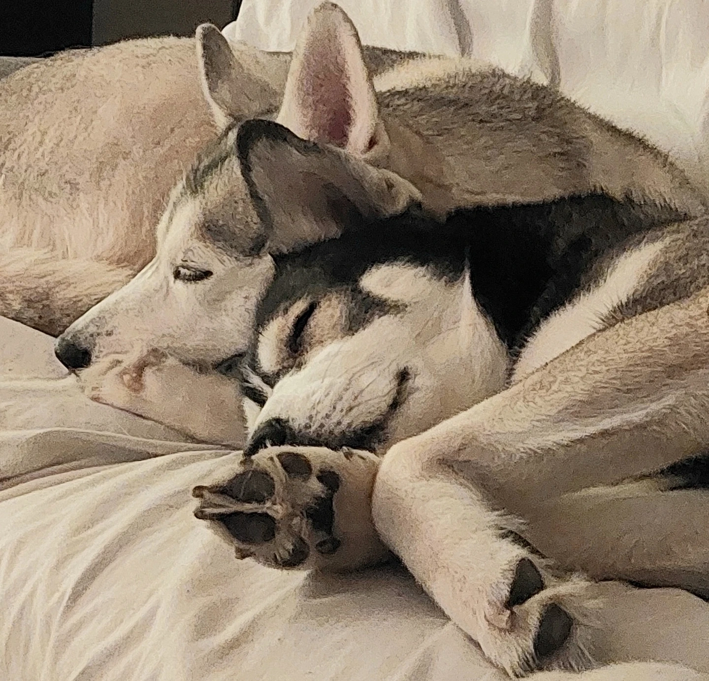 Two adorable Husky Sister dogs snuggled up together, sound asleep on a comfy bed. Their fur looks so soft and warm! It's like a postcard of pure canine love.