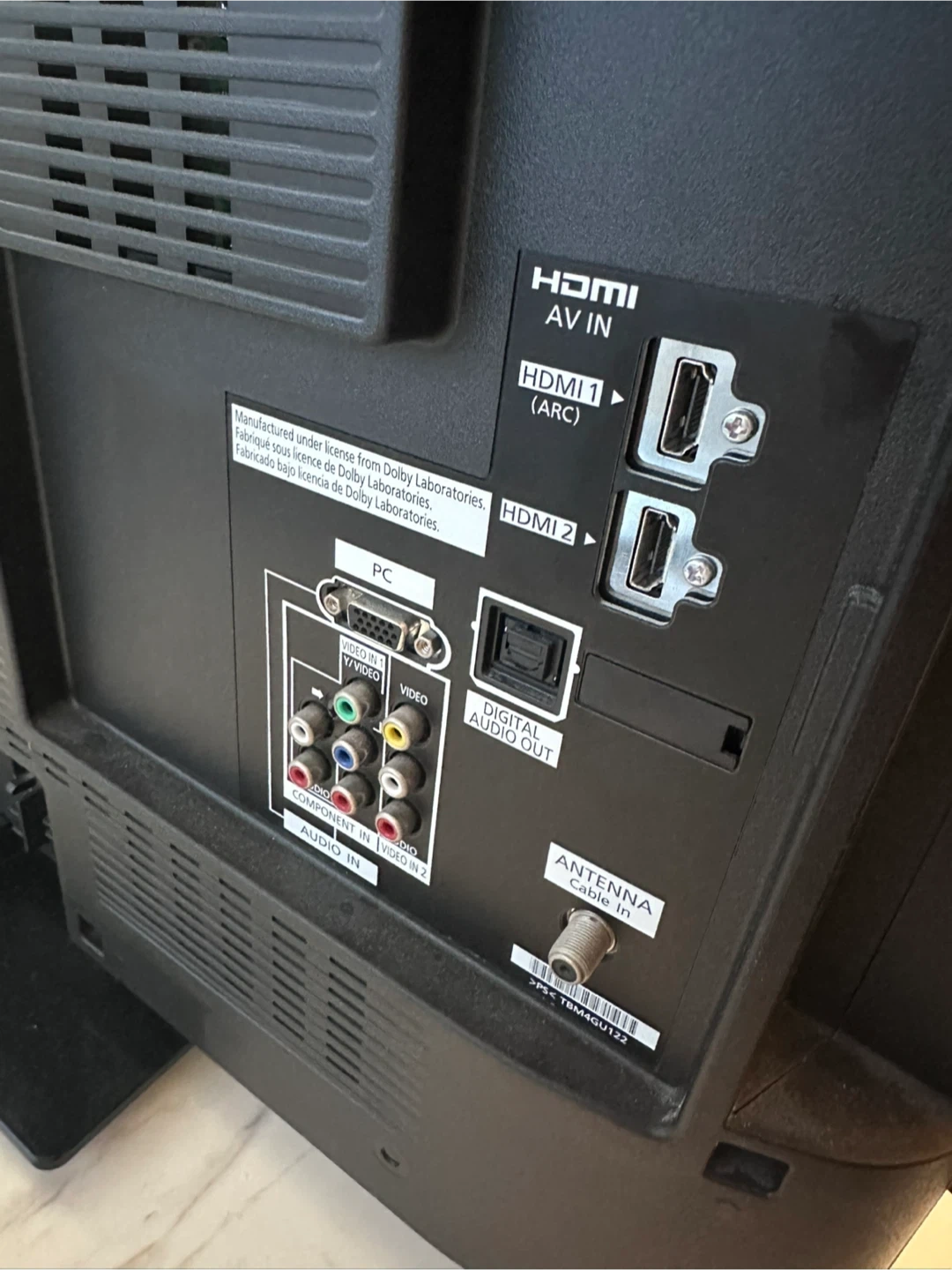 Panasonic television. It's a black flat-screen TV. It has multiple HDMI inputs, PC input, and component audio/video in.