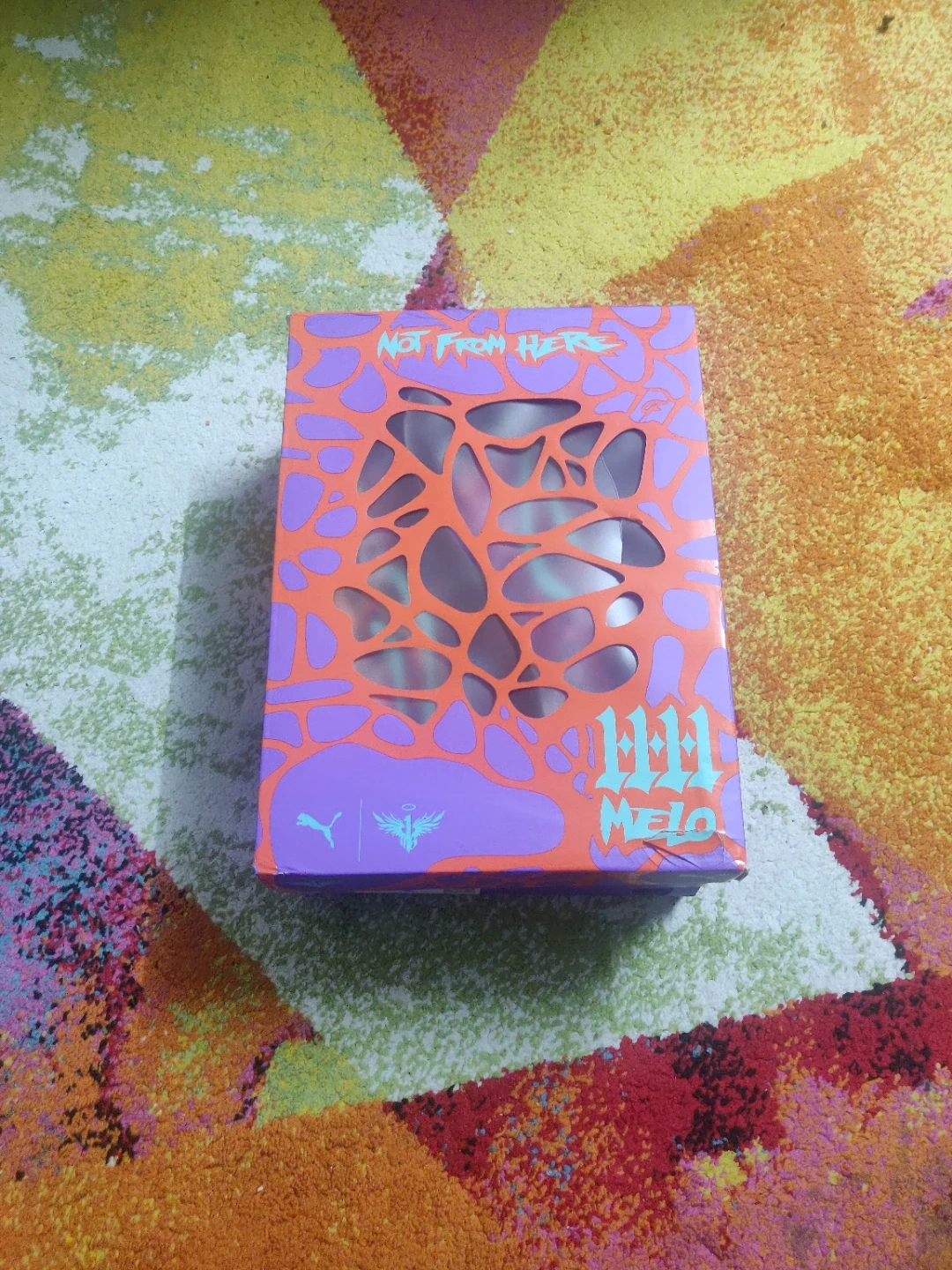 These Puma LaMelo Ball MB.01 basketball shoes come in a vibrant "Not From Here" colourway. woren once to see if it fits which it doesn't,I bought this very recently. They feature a distinctive design with a mix of pink, purple, and orange. The original box is included. This shoe is designed for performance on the court.