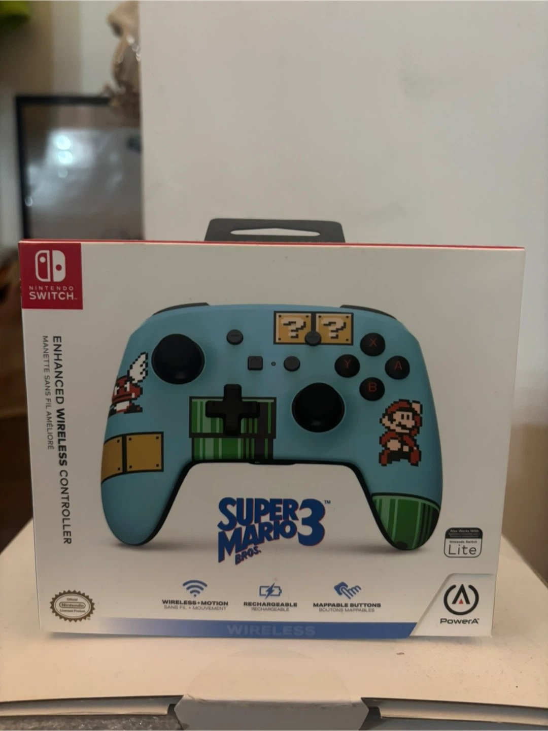 This is an enhanced wireless controller for the Nintendo Switch, featuring a Super Mario 3 Bros. theme. It's rechargeable and has mappable buttons. This controller offers wireless motion control for an improved gaming experience.