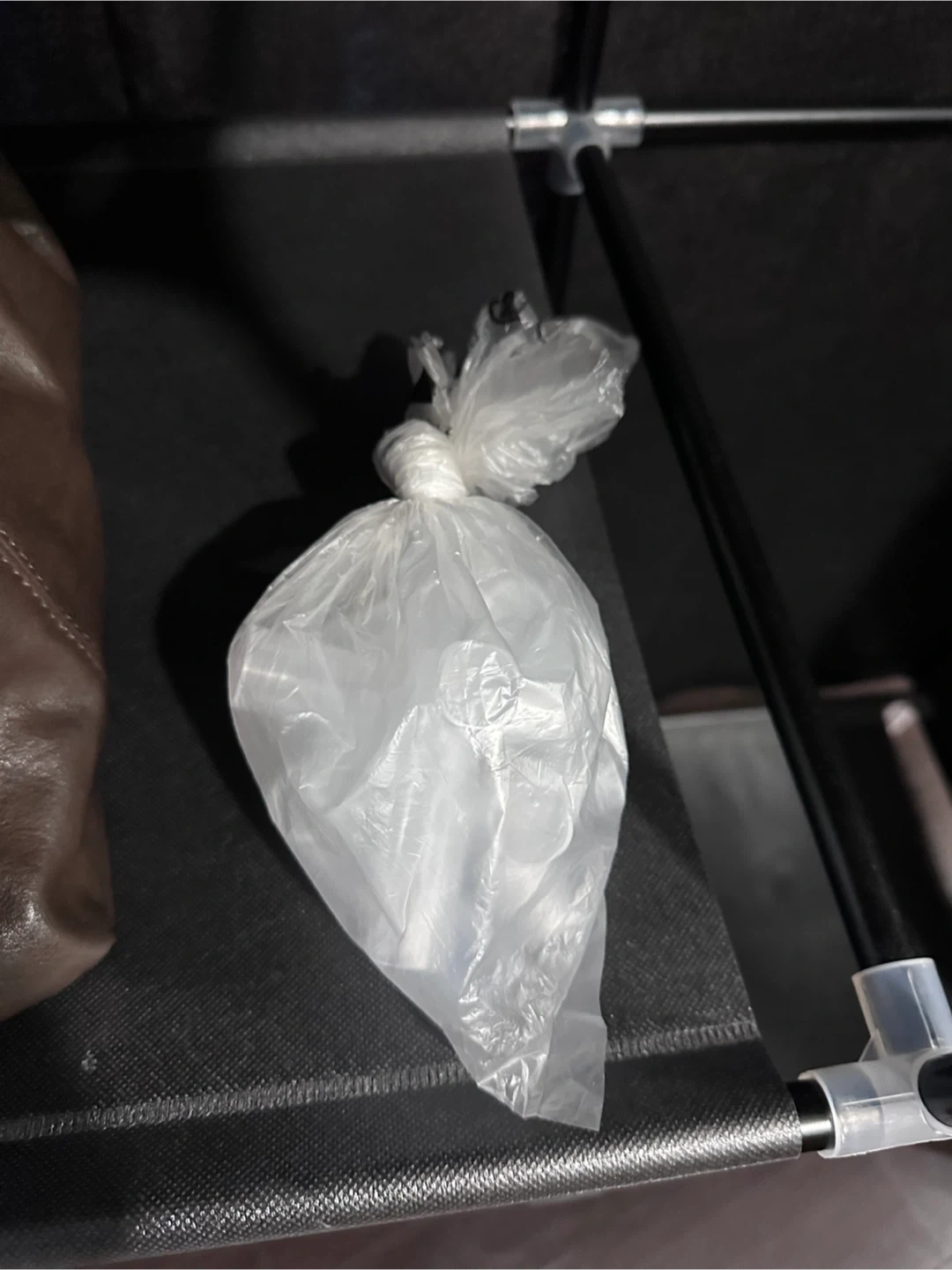 This is a black portable wardrobe closet. It's made of fabric with metal poles and plastic connectors. It has multiple shelves and a hanging rod.