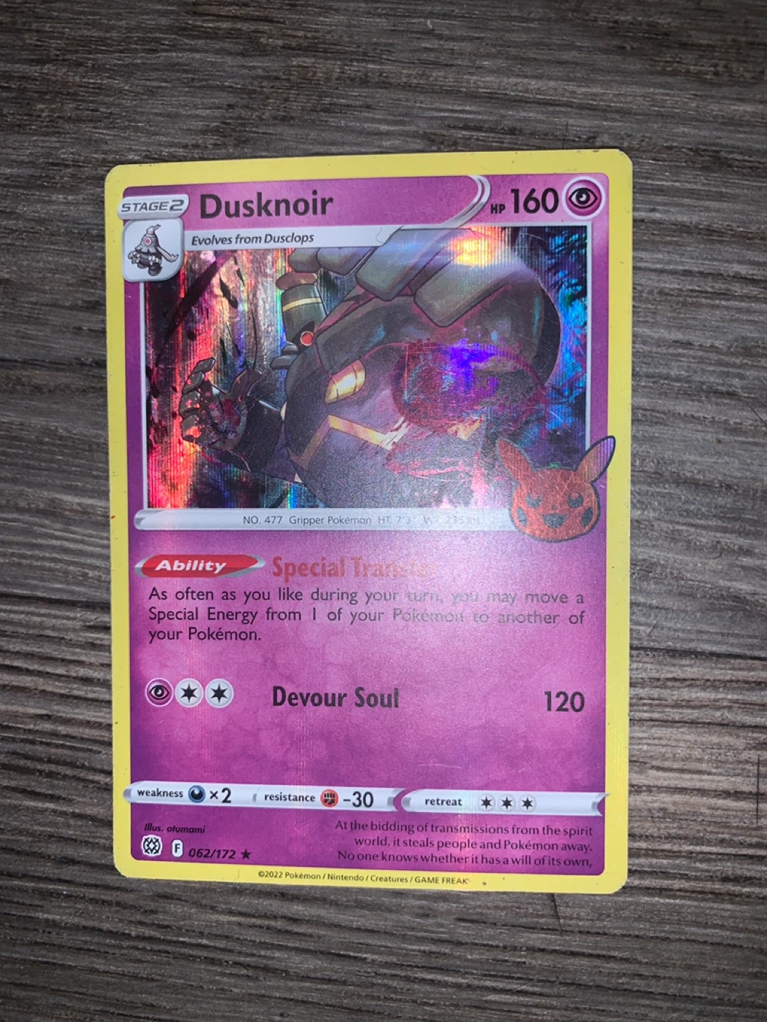 This is a Dusknoir trading card, number 062/172. It has 160 HP and the ability 'Special Transition'. Its attack is 'Devour Soul'. The card has a weakness of x2 and resistance of -30.