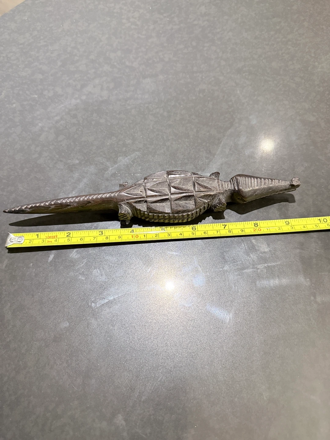 This is a carved wooden alligator figurine. It measures approximately 9 inches long. This unique piece would make a lovely decorative item.