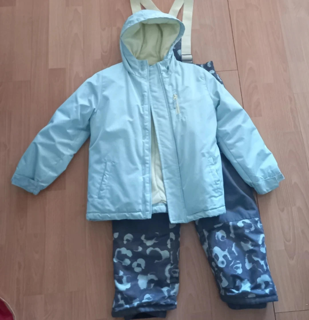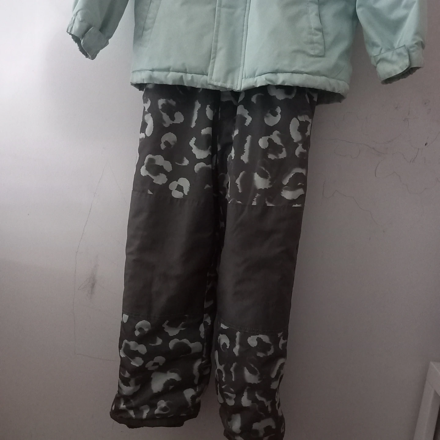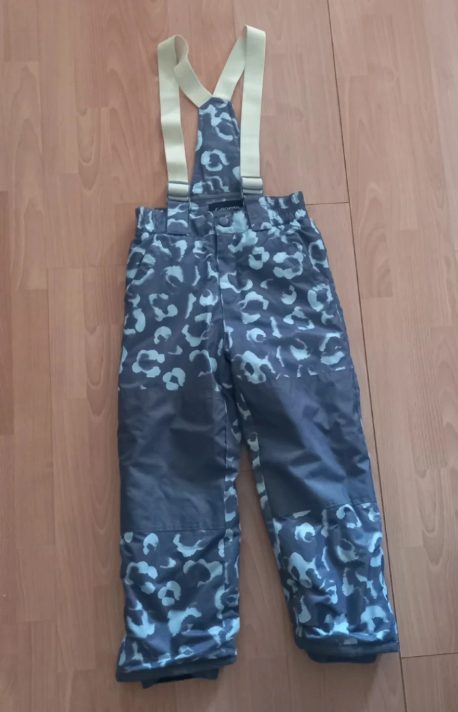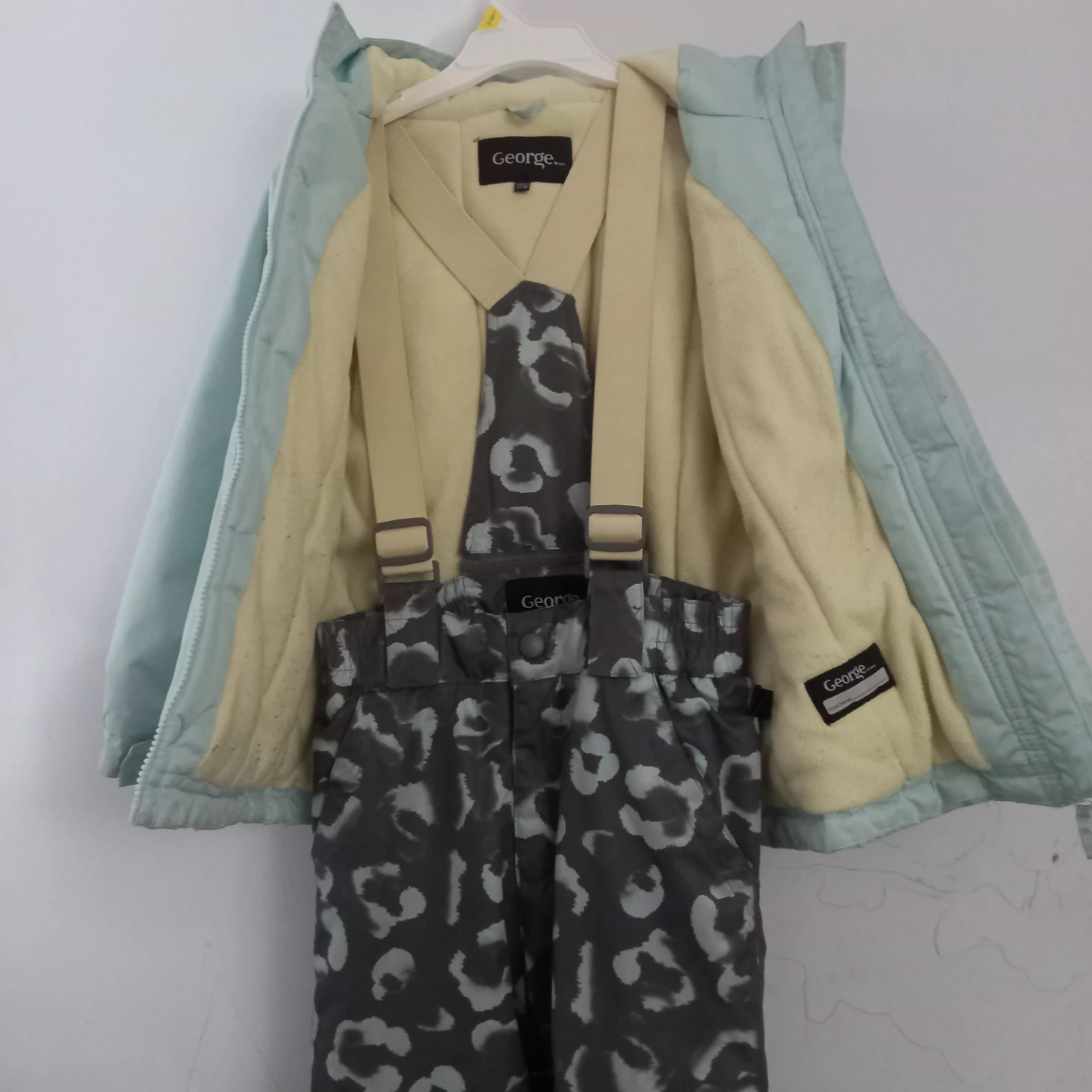 This George kids ski suit set includes a light blue jacket and grey snow pants with a leopard print. The jacket has a hood and zippers up the front. The snow pants have adjustable suspenders. It's great for keeping warm on the slopes!