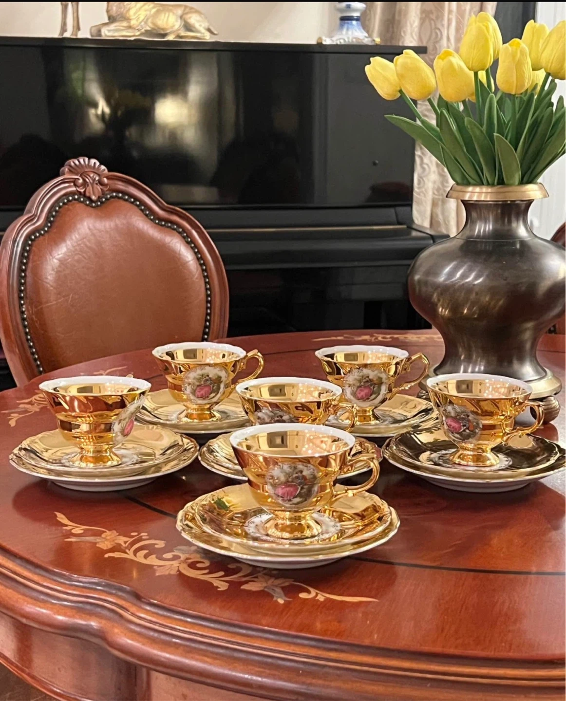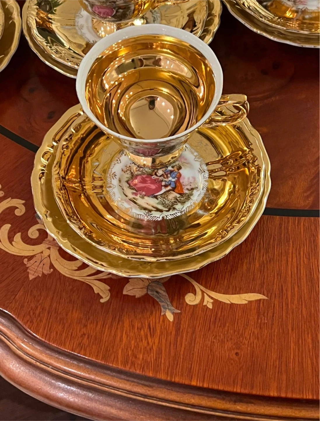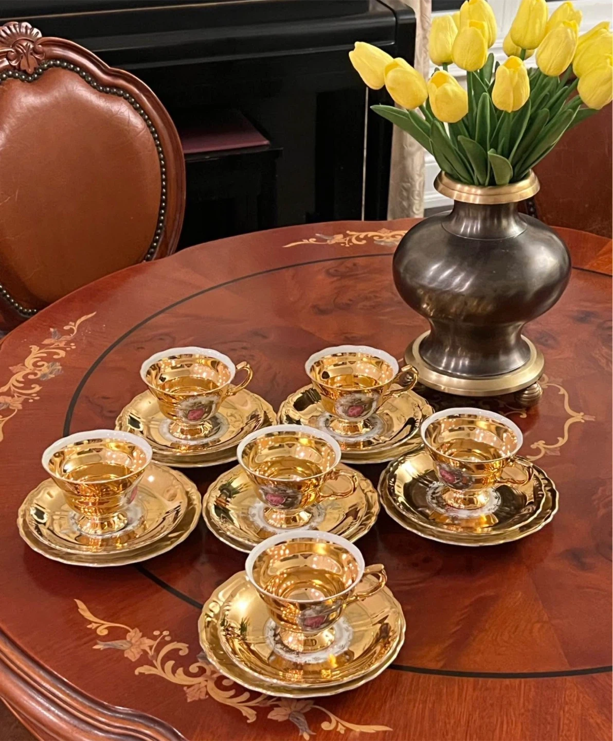 Set of 6 Gold Porcelain Teacups and Saucers - Made in Japan