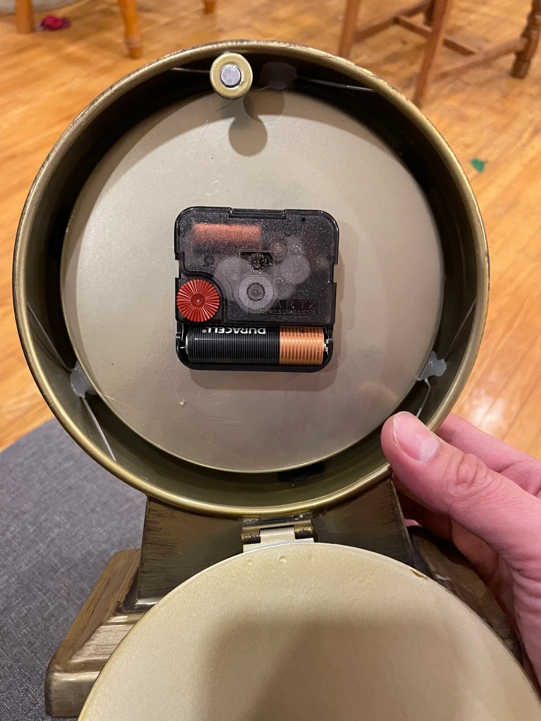 This decorative table clock features a vintage design with Roman numerals. It's made of a gold-tone metal. The clock measures 8.5 inches tall, 6.25 inches wide, and 3.5 inches deep. It runs on one AA battery, which is not included.