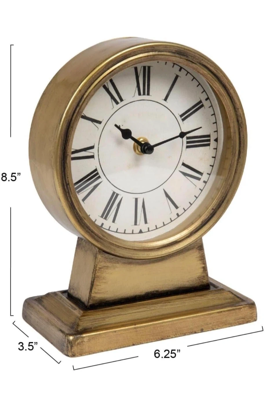 This decorative table clock features a vintage design with Roman numerals. It's made of a gold-tone metal. The clock measures 8.5 inches tall, 6.25 inches wide, and 3.5 inches deep. It runs on one AA battery, which is not included.