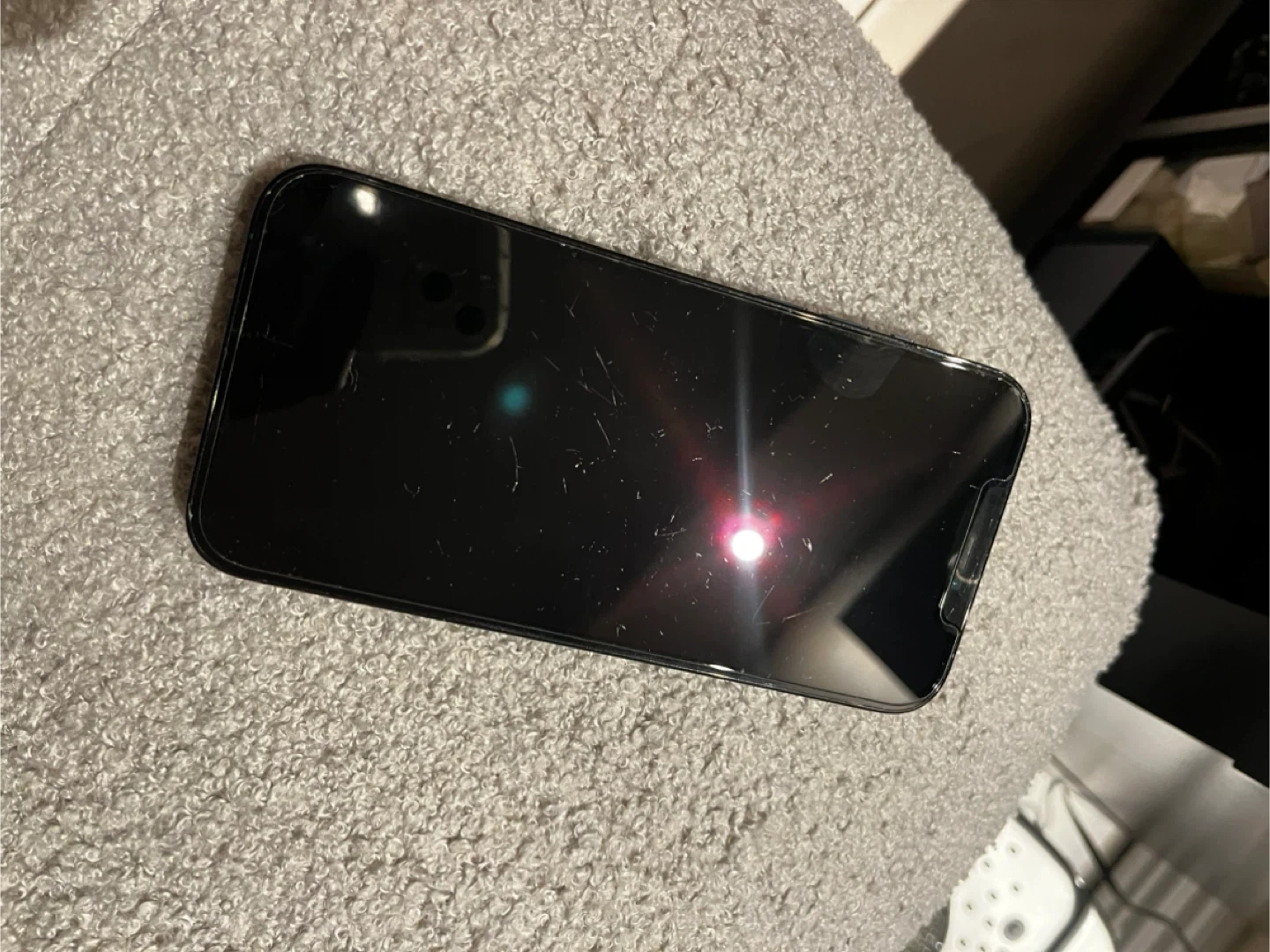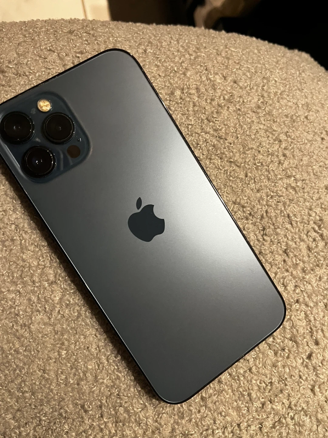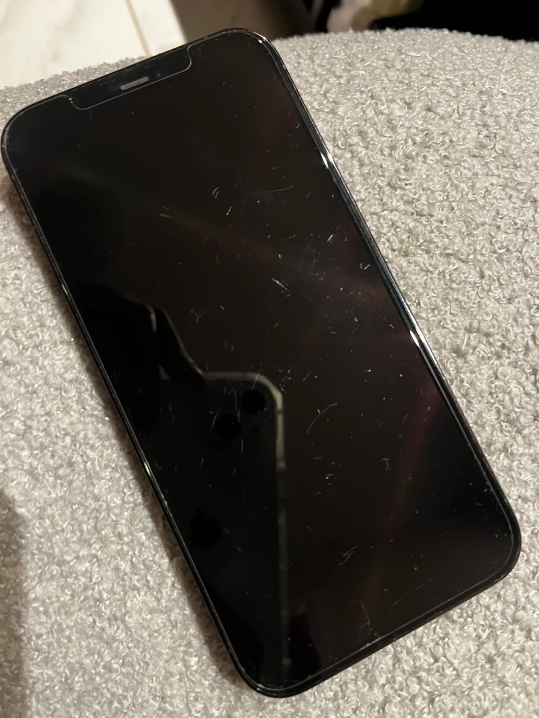 This is an Apple iPhone 12 Pro Max in Graphite. It's a 256 model. The phone has some light scratches on the screen. Back is clean tho.