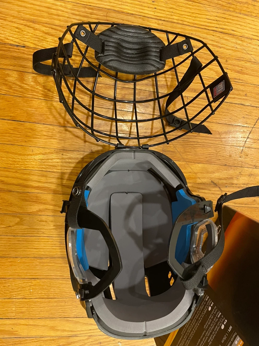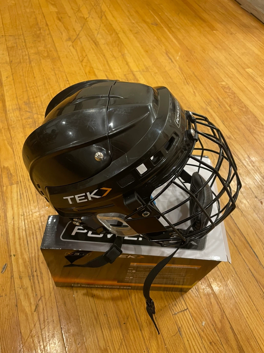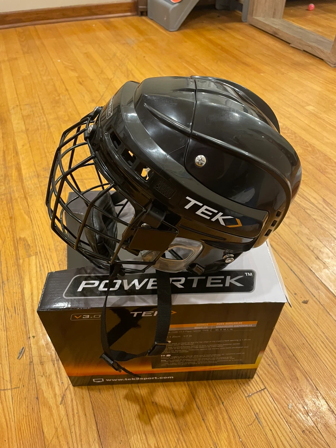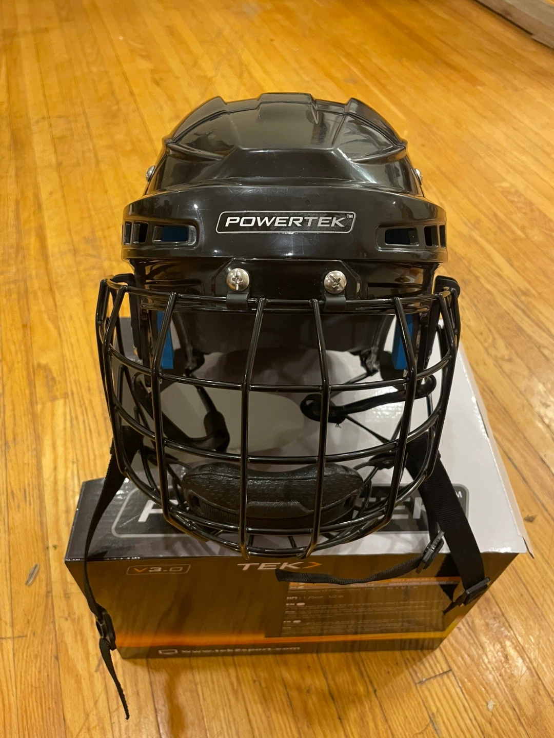 This is a Powertek V3.0 Player Helmet with an integrated cage. It's a certified hockey helmet/face protector combo. The helmet is black and includes adjustable straps.
