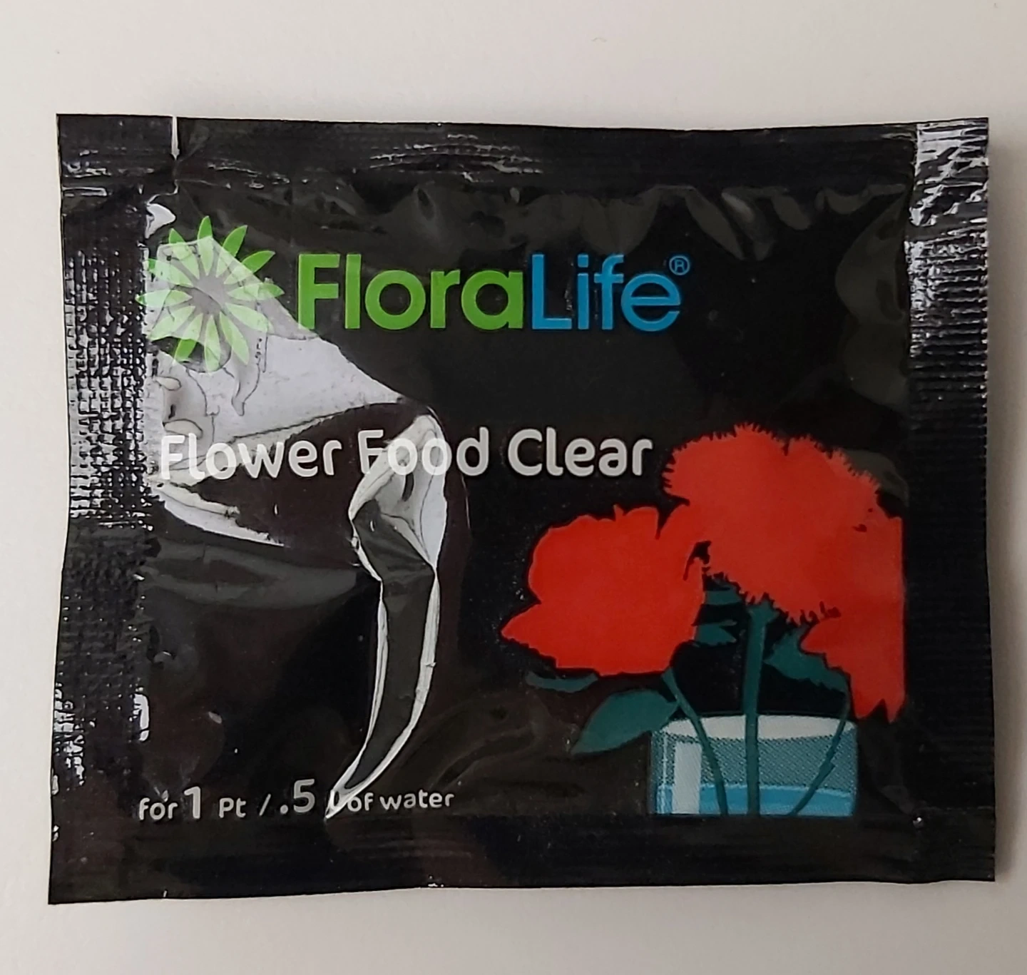 FloraLife Flower Food Clear powder for fresh cut flowers. This packet treats 1 Pt / 0.5 L of water. It's designed to keep your flowers fresh and vibrant. For use with cut flowers in a vase.