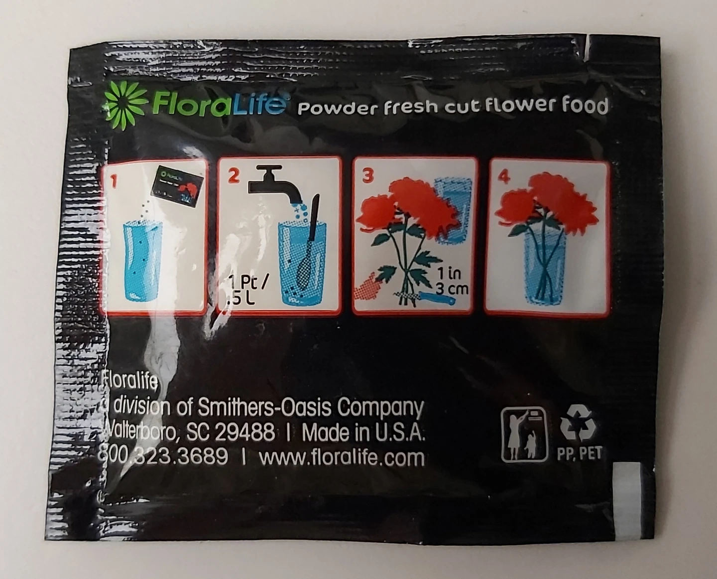 FloraLife Flower Food Clear powder for fresh cut flowers. This packet treats 1 Pt / 0.5 L of water. It's designed to keep your flowers fresh and vibrant. For use with cut flowers in a vase.