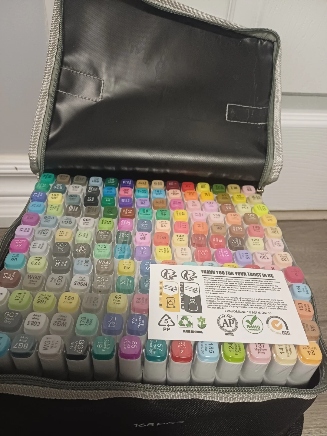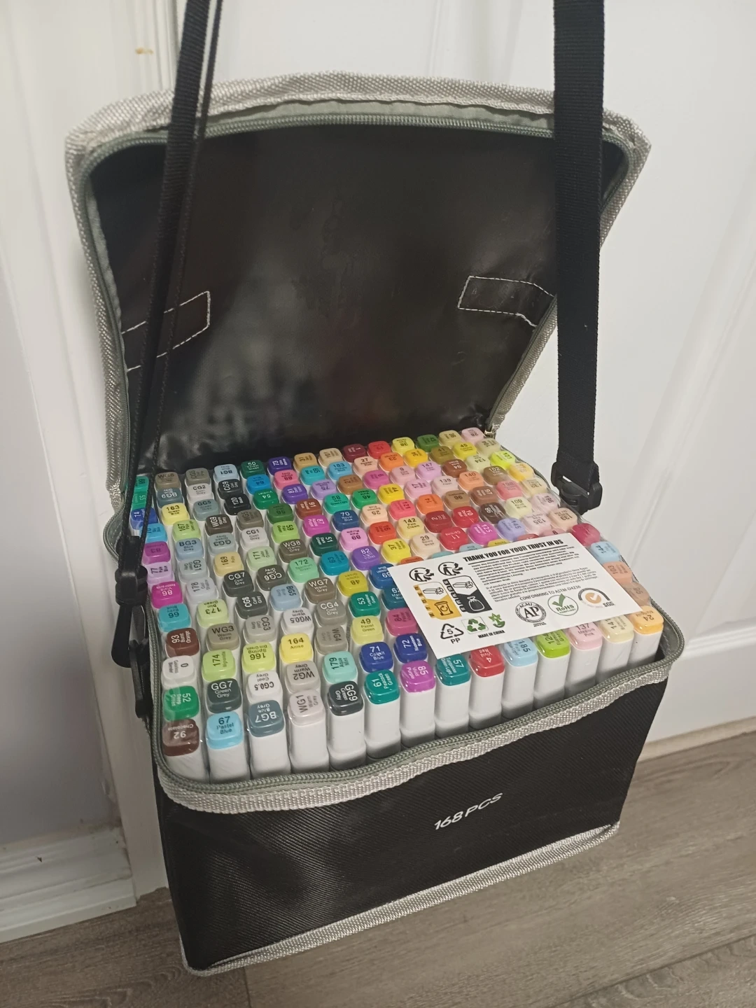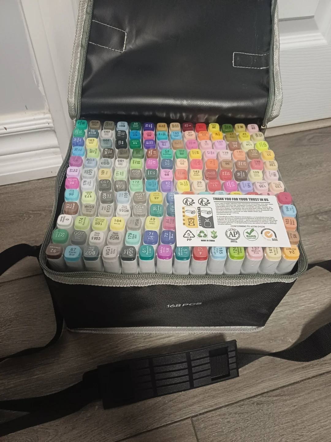 This is a set of 168 markers, including a carrying case for easy transport. The markers offer a wide range of colours for various art projects. They're great for sketching, drawing, and colouring. The case is designed to hold all 168 markers neatly.
