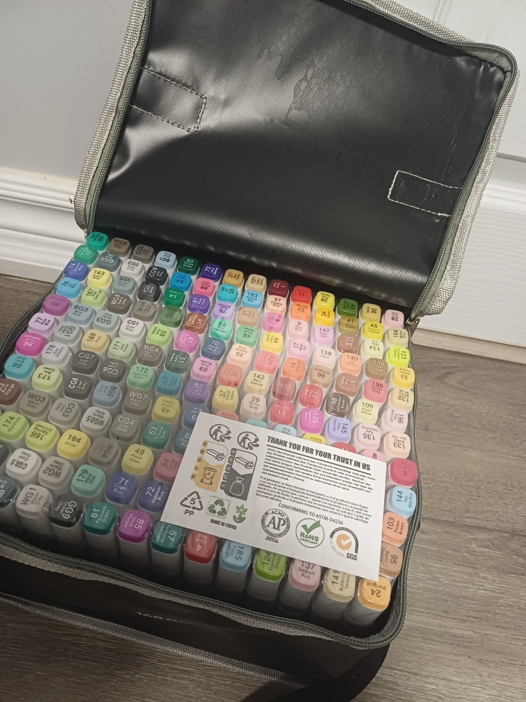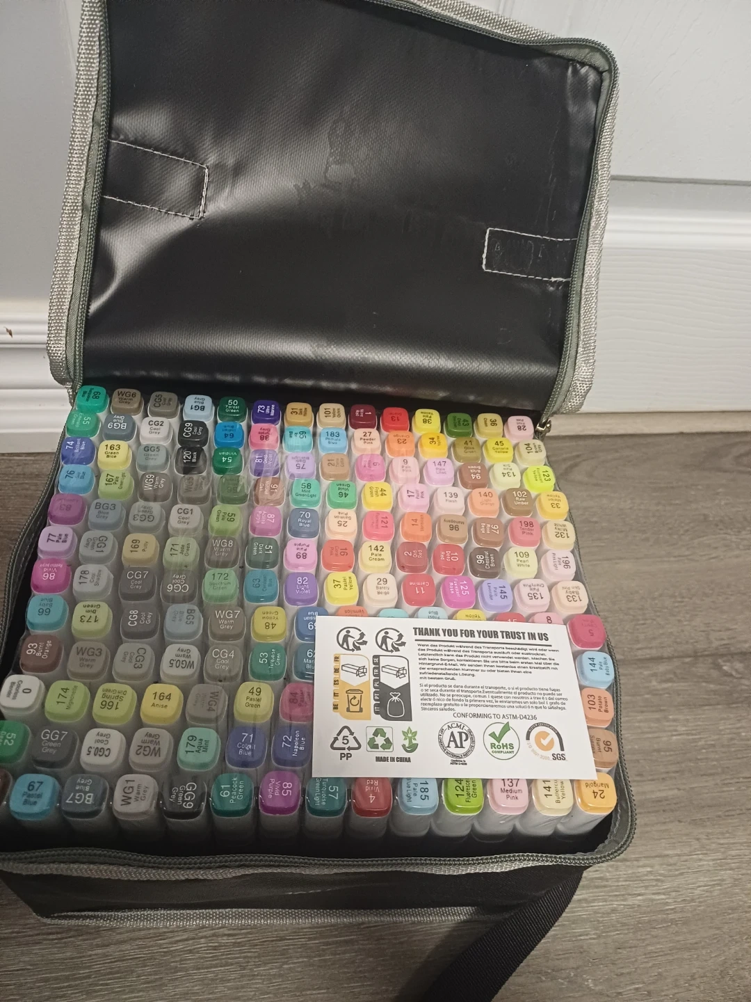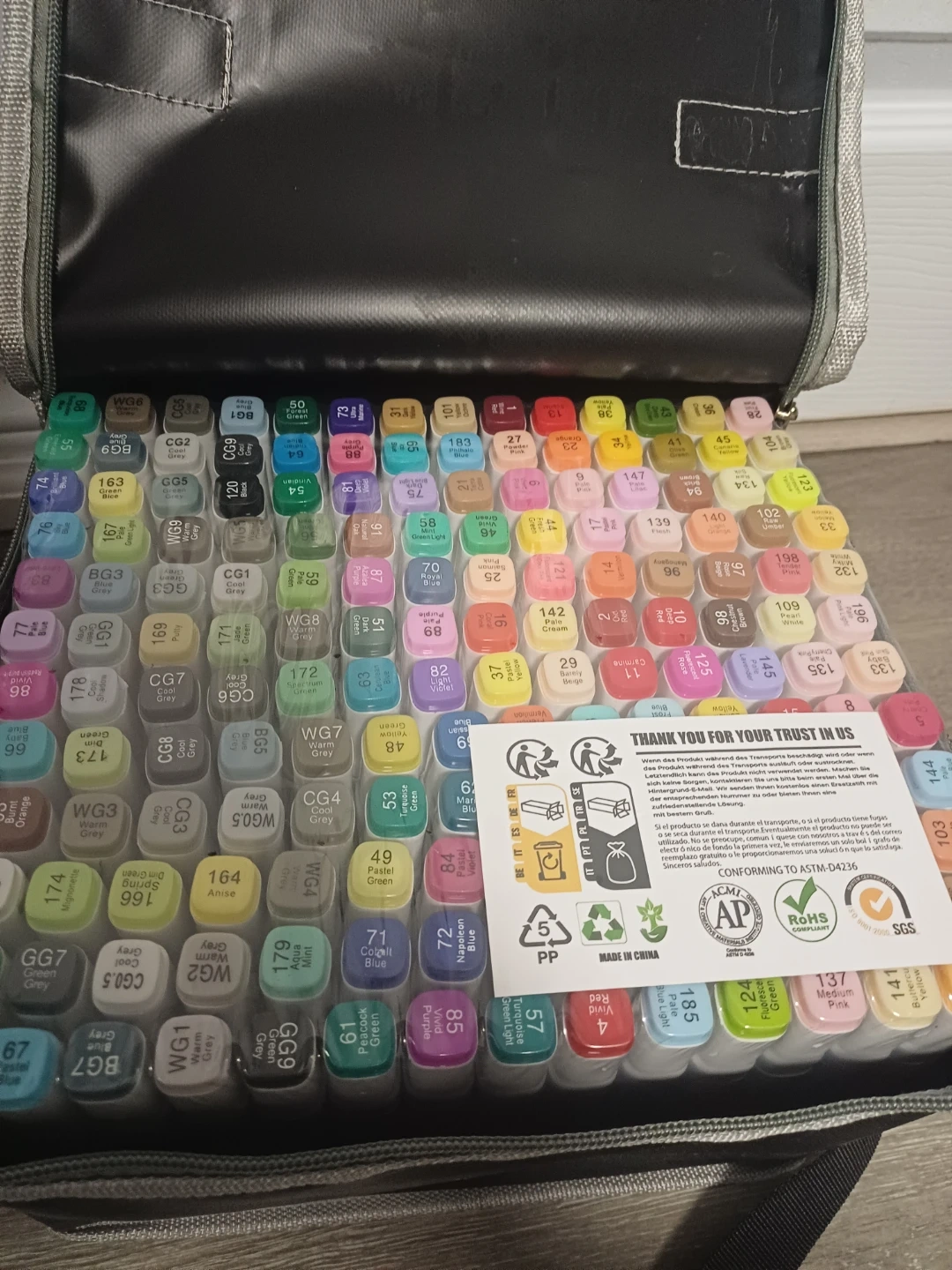 This is a set of 168 markers, including a carrying case for easy transport. The markers offer a wide range of colours for various art projects. They're great for sketching, drawing, and colouring. The case is designed to hold all 168 markers neatly.