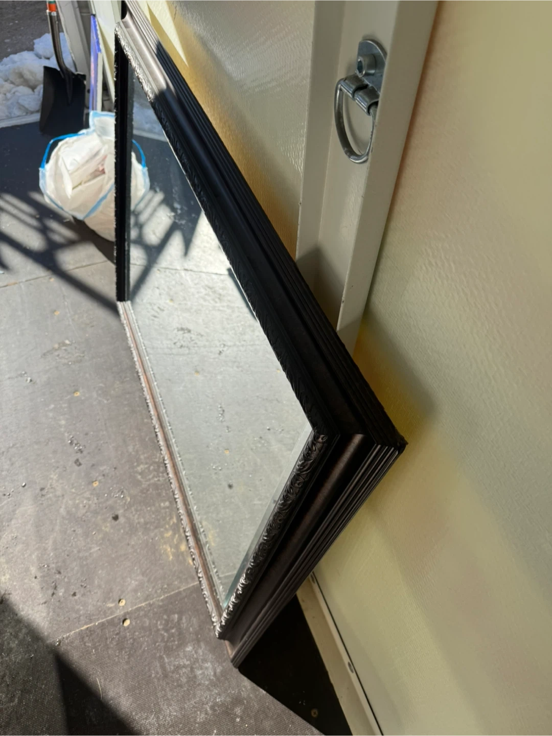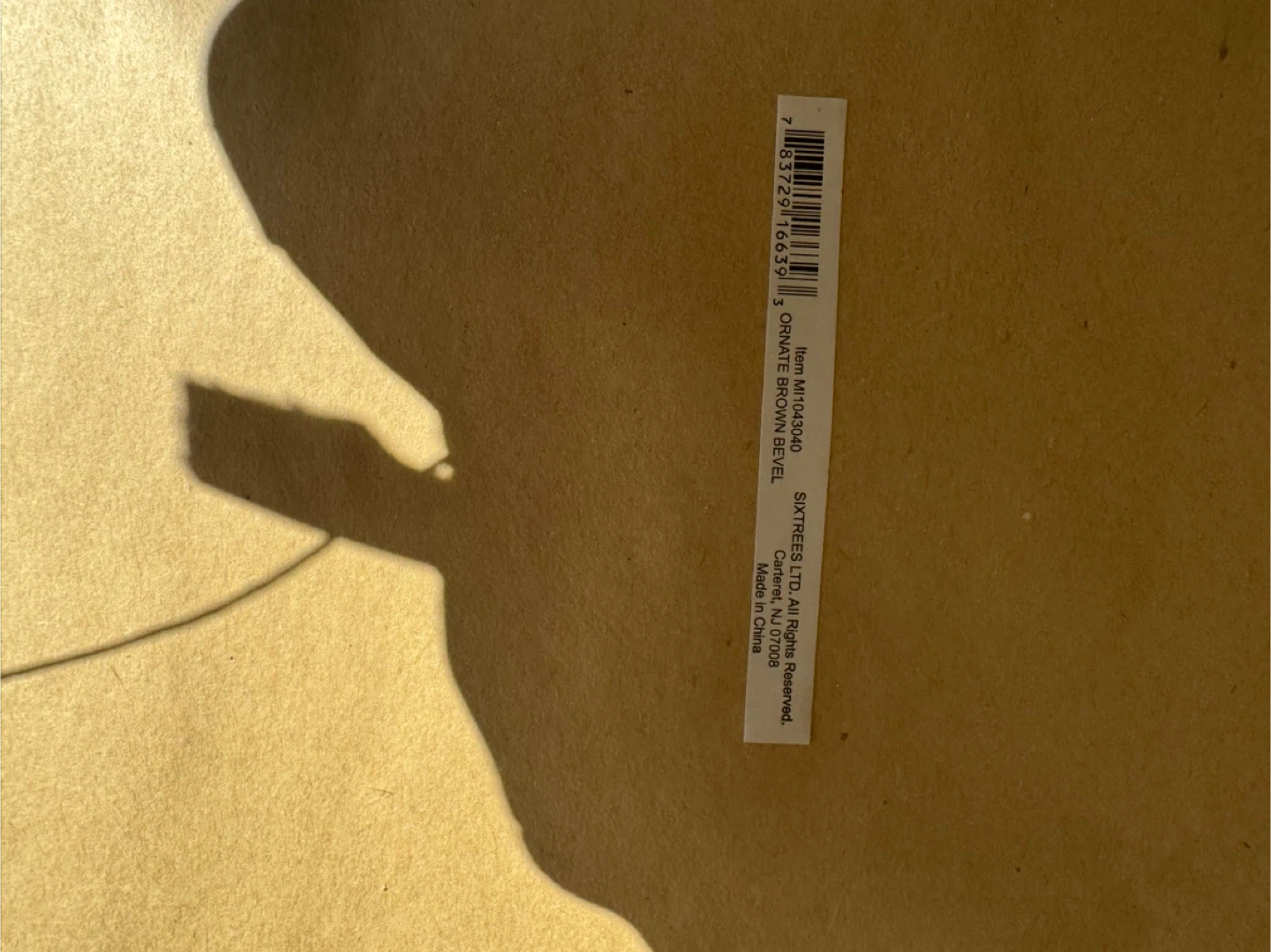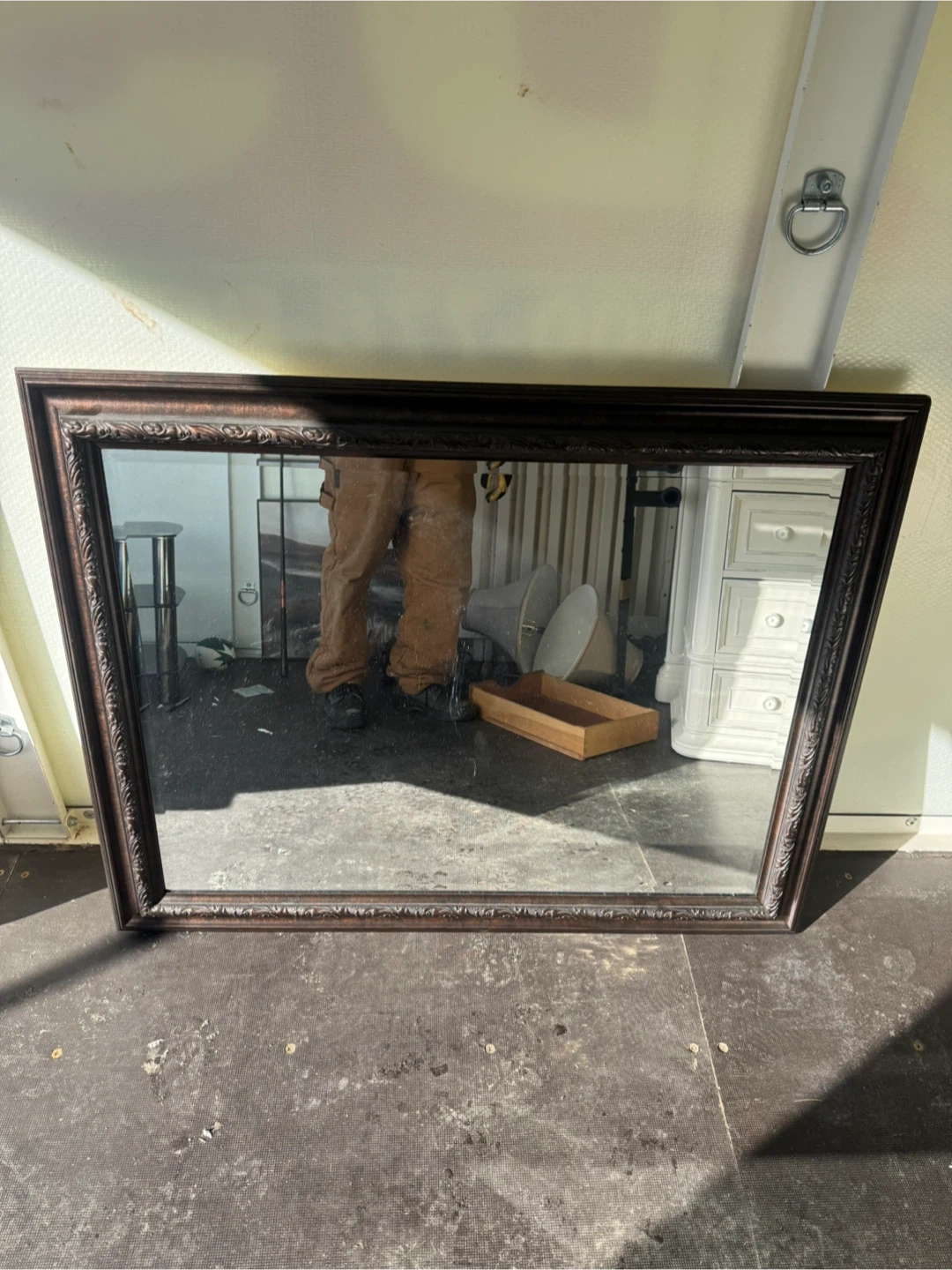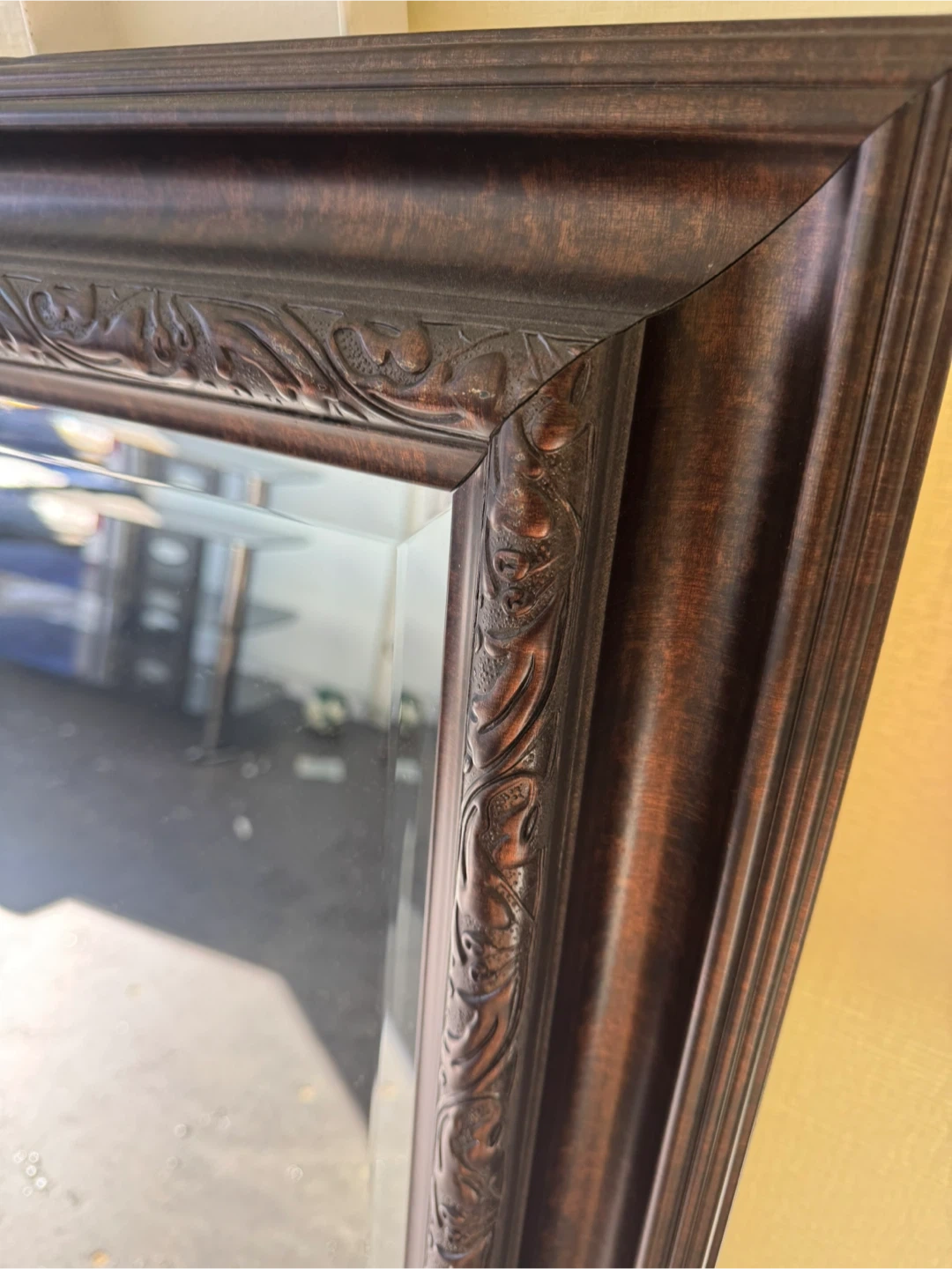This is a large, ornate mirror with a brown frame. It's perfect for adding a touch of elegance to any room! The frame has intricate detailing. Includes hanging wire on the back.