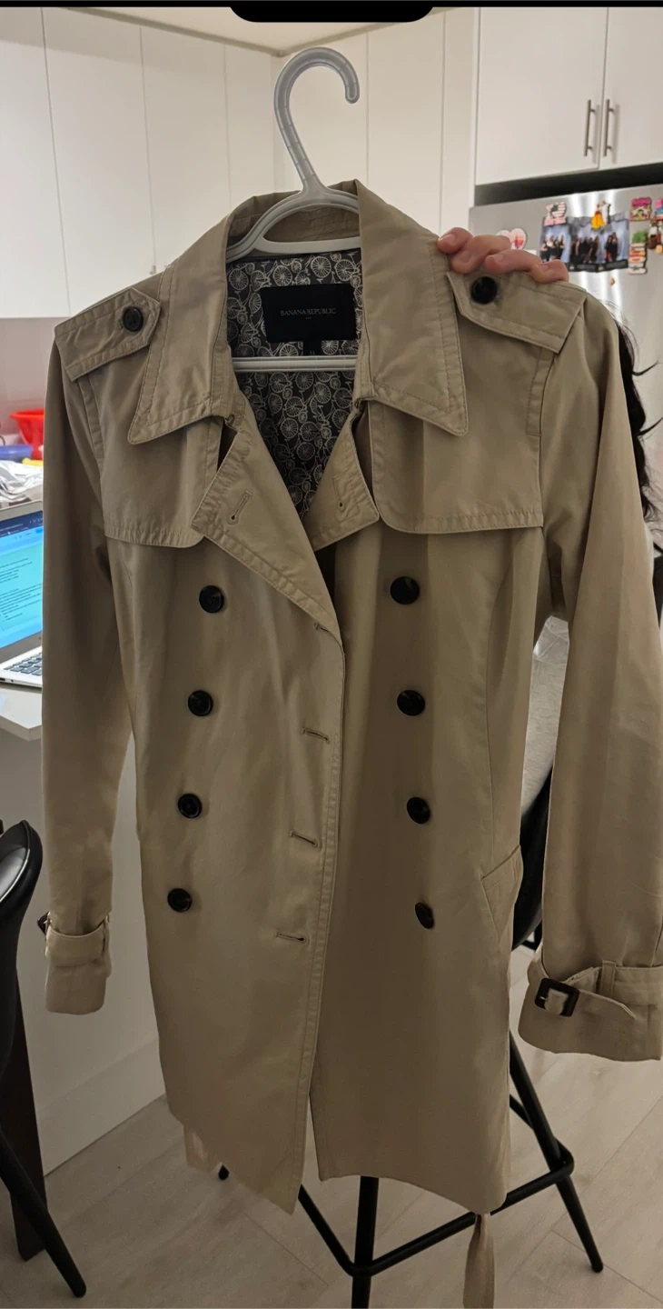 A classic Banana Republic tan trench coat. Double-breasted with button closure and a tie belt. This coat is water-resistant and perfect for transitional weather.