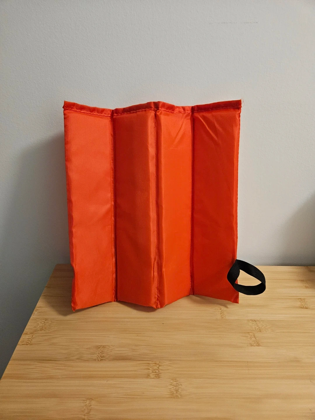 This is a folding seat pad from Canadian Tire. It's red and made of nylon. It folds up and comes with a drawstring bag for easy carrying. It's great for outdoor events or camping trips!