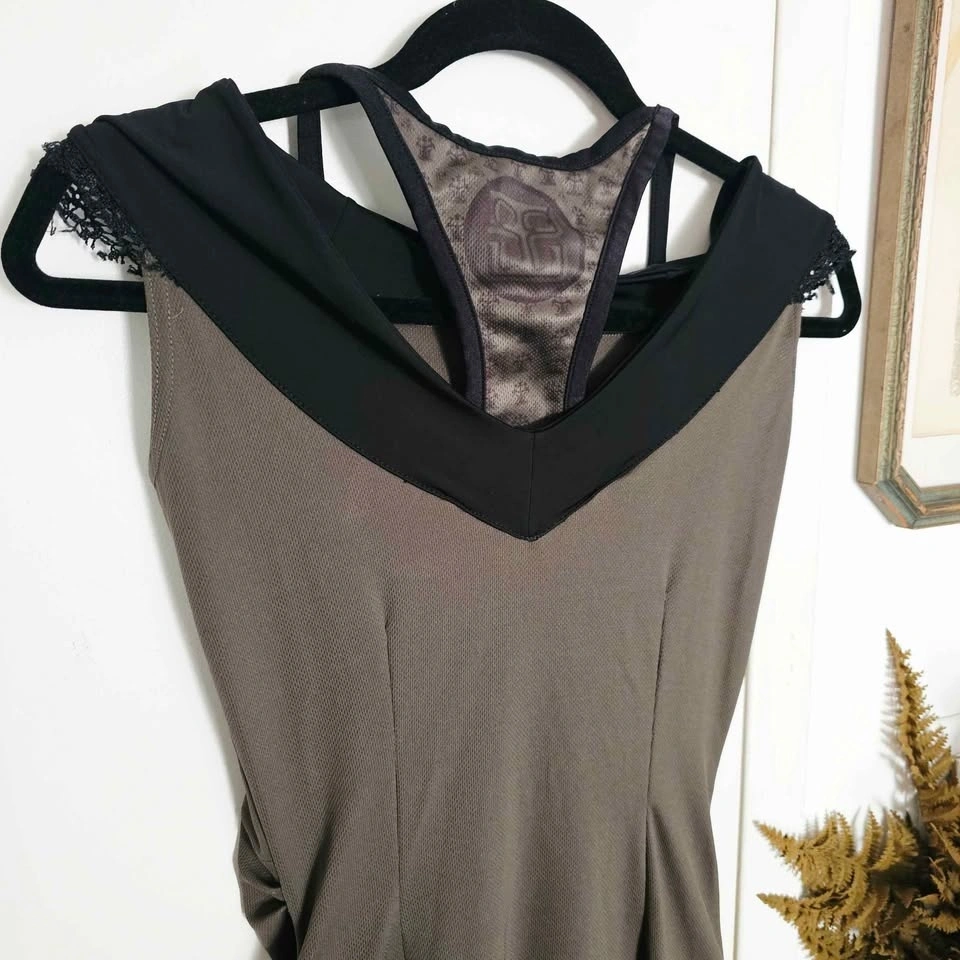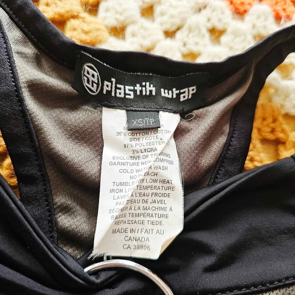 Dress has adjustable skinny shoulder straps with a lacy black off-shoulder overlay. It is ruched at the sides for a super flattering fit, with more black lace at the hips/ thighs. The back has a mesh racerback section with patterning and a Plastik Wrap logo. It is very comfortable, stretchy and breathable. Perfect for industrial or cybergoth clubwear, or any futuristic looks.