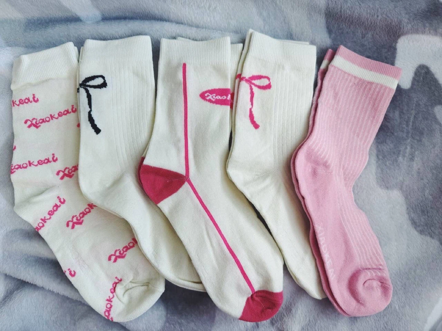 Set of five pairs of women's socks. Features various designs including pink ribbed, cream with pink accents, and cream with repeating text. Great for spring and summer. One size fits most