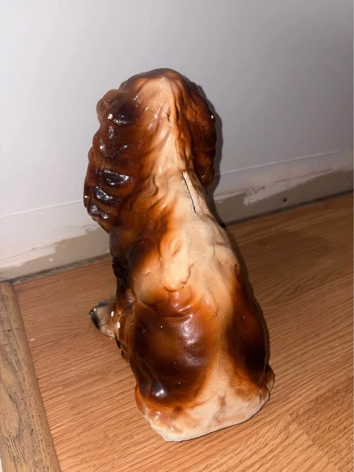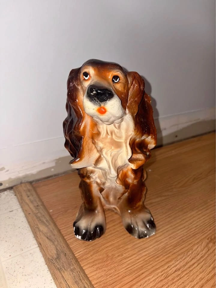 Chalkware vintage cocker spaniel dog piggy bank from the 40-50’s. They used to give these away as prizes at the fair. Roughly 10” tall.