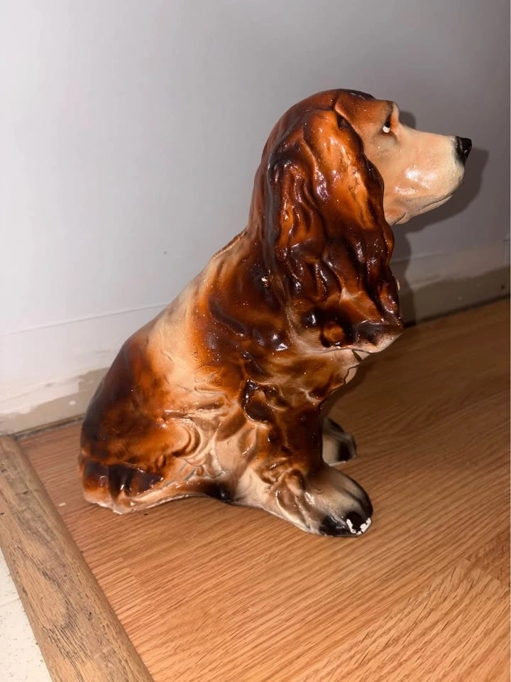 Chalkware vintage cocker spaniel dog piggy bank from the 40-50’s. They used to give these away as prizes at the fair. Roughly 10” tall.