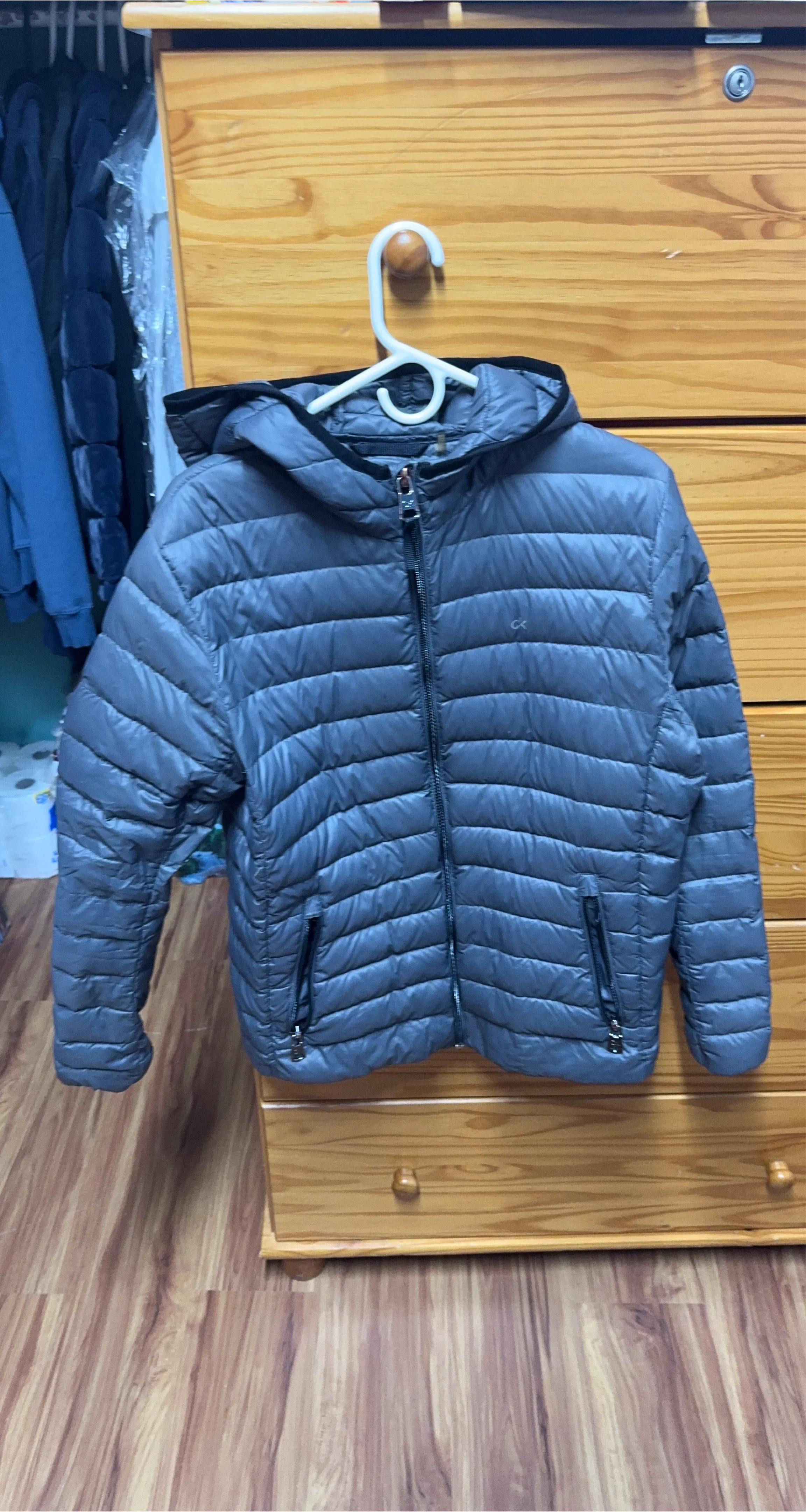 Lightweight gray puffer jacket from Calvin Klein. It's a size medium with a warmth factor of 7 degrees. The jacket has a full zip front and two zip pockets. Great for today’s cold weather!