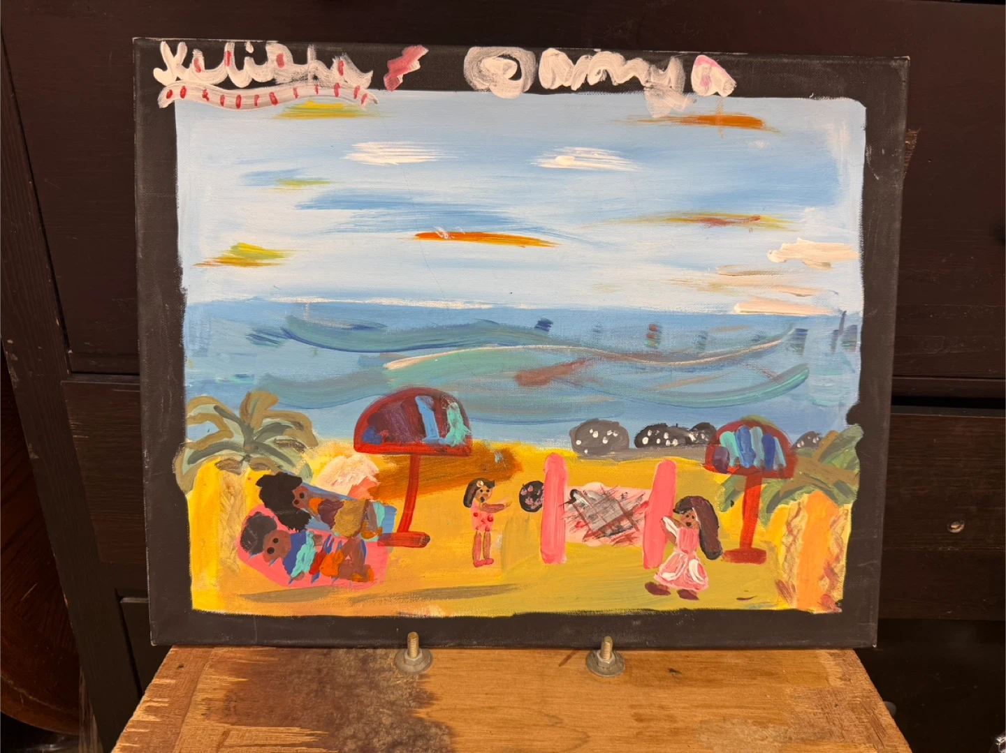 This is a charming, handmade painting depicting a lively beach scene. It's rendered with acrylics on canvas, showcasing a sunny day with umbrellas, people, and the ocean. A fun piece for adding a splash of colour!