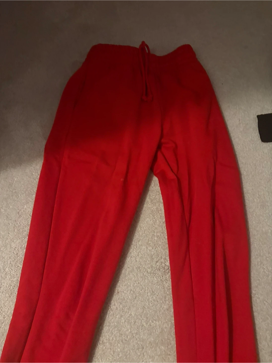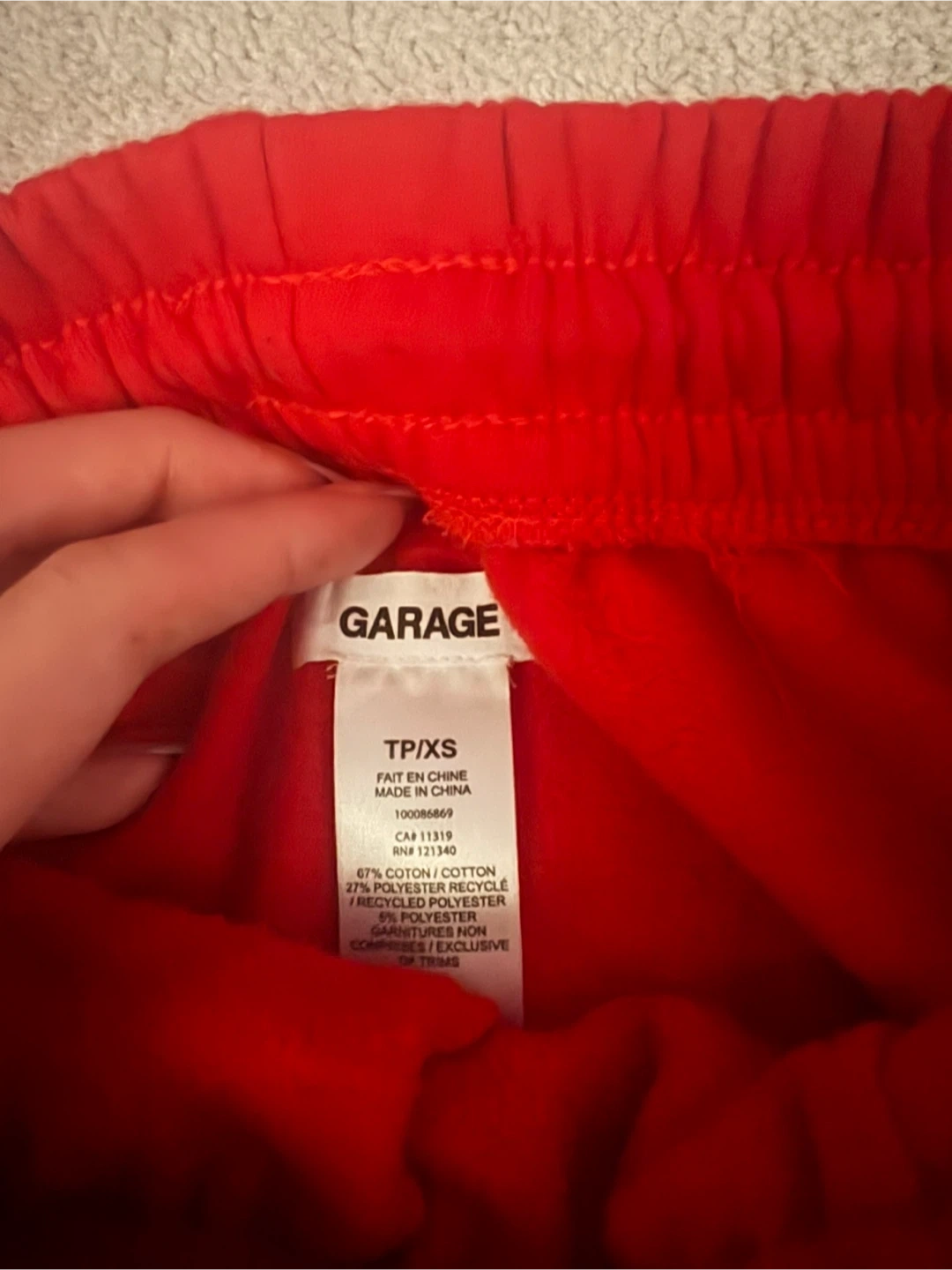 Garage red joggers. It's a size TP/XS. The material is 67% cotton and 27% recycled polyester. These would be comfy for lounging or casual wear!