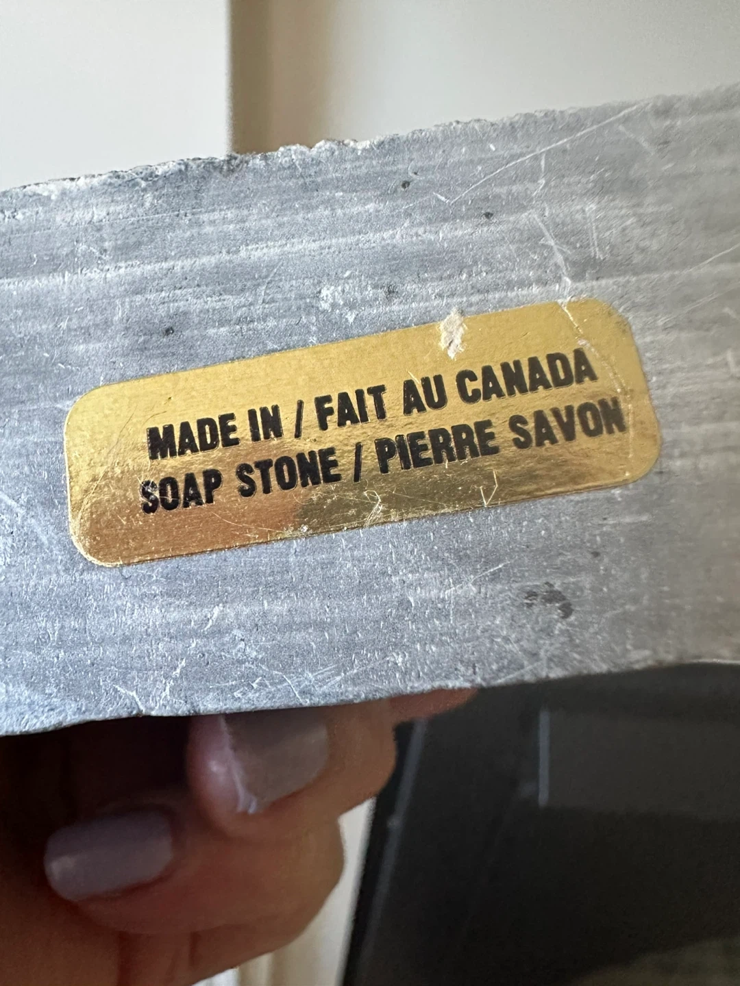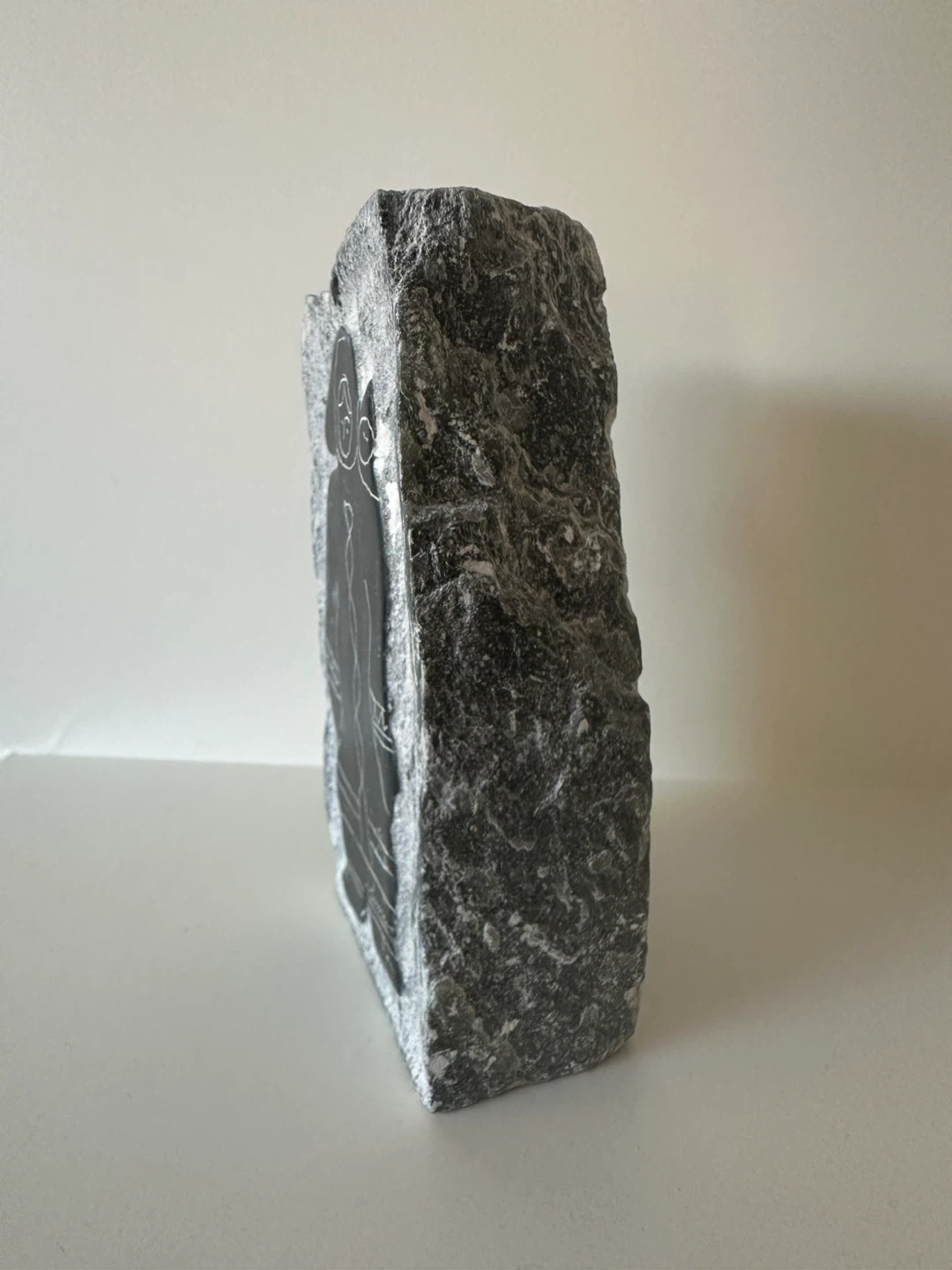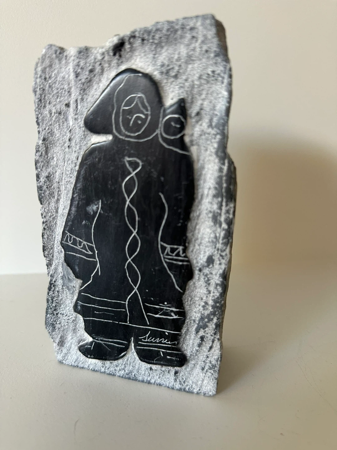 This is a stone carving featuring a mother holding a child. The carving is etched into a natural stone slab with rough edges. The artist's signature, is visible on the front.