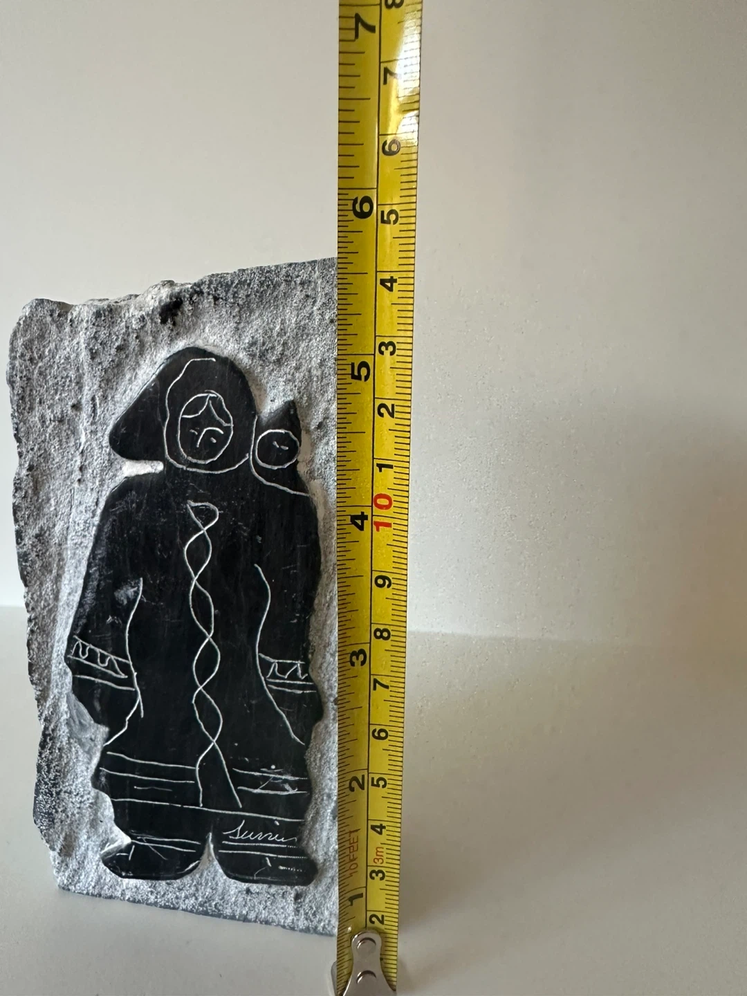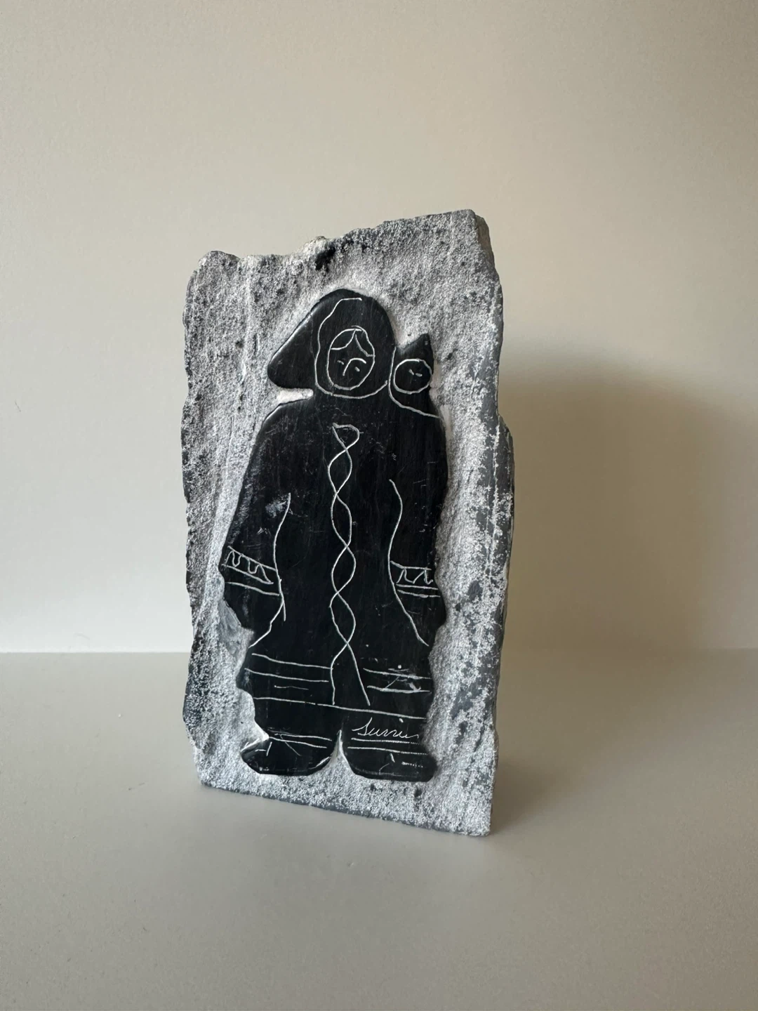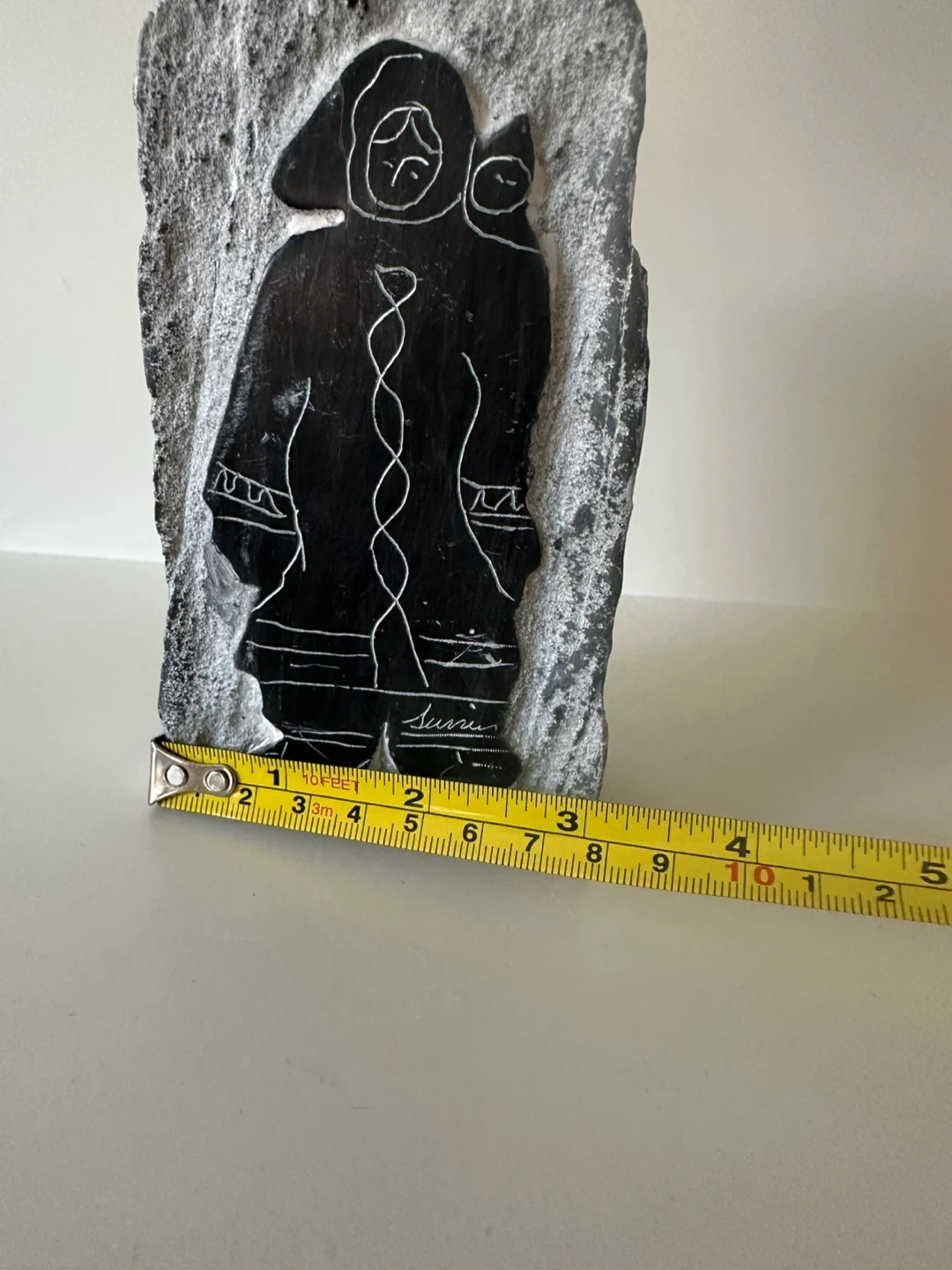 This is a stone carving featuring a mother holding a child. The carving is etched into a natural stone slab with rough edges. The artist's signature, is visible on the front.